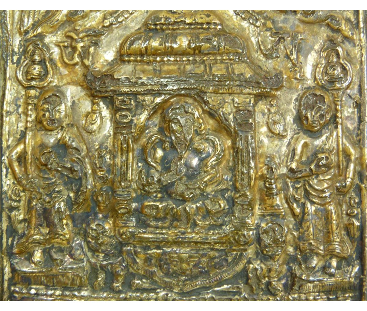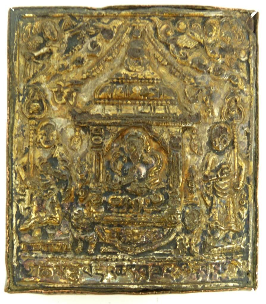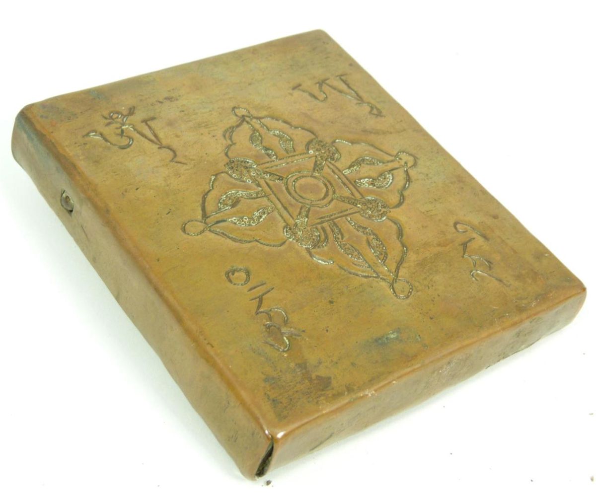 Depicting an imperial scene with the emperor surrounded by his servants. Mounted in a signed copper backing. Measures 10cm height x 9cm width. Weight 240g.