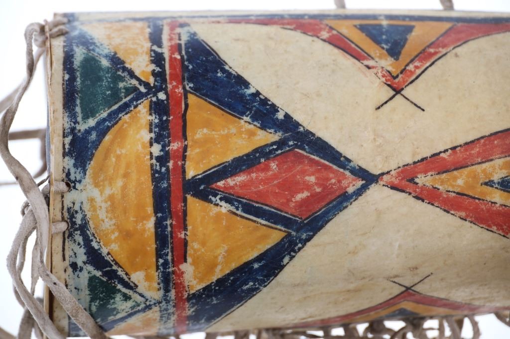 This is a truly historic and artistically stunning,19th-century parlfeche polychrome painted war bonnet case from the Northern Plains in a massive, rare size. The piece exhibits an unusually large size and shows parfleche rawhide hide that is Indian tanned hide sewn and is covered in beautiful polychrome mineral pigment painted geometric designs on both sides as well as the lid and bottom. The appears to be from the Apsaalooke / Apsáalooke Crow. The lid, bottom and side have long Indian tanned hide fringes that truly set the piece apart. The artwork shows colors of red, green, blue, yellow, with black outline and with prominent thick Indian tanned hide fringes beautifully hanging from the bottom. This is quite possibly one of the best 1800's era war bonnet cases offered for public sale. The piece is well preserved with rich coloring and no major damages or loss. The piece shows the correct wear and loss to the paint that would be expected on such an early and authentic example. Measures overall as displayed 64-inches long, the case without fringes is 22-inches long by 7-inches wide by 6.5-inches deep. Of the other examples previously offered, this appears to be one of, if not the largest and would have held and impressive feathered headdress or war bonnet. From the same collection as the bonnet case sold by our company earlier this year for nearly $3,000 being slightly smaller (this example being slightly bigger).