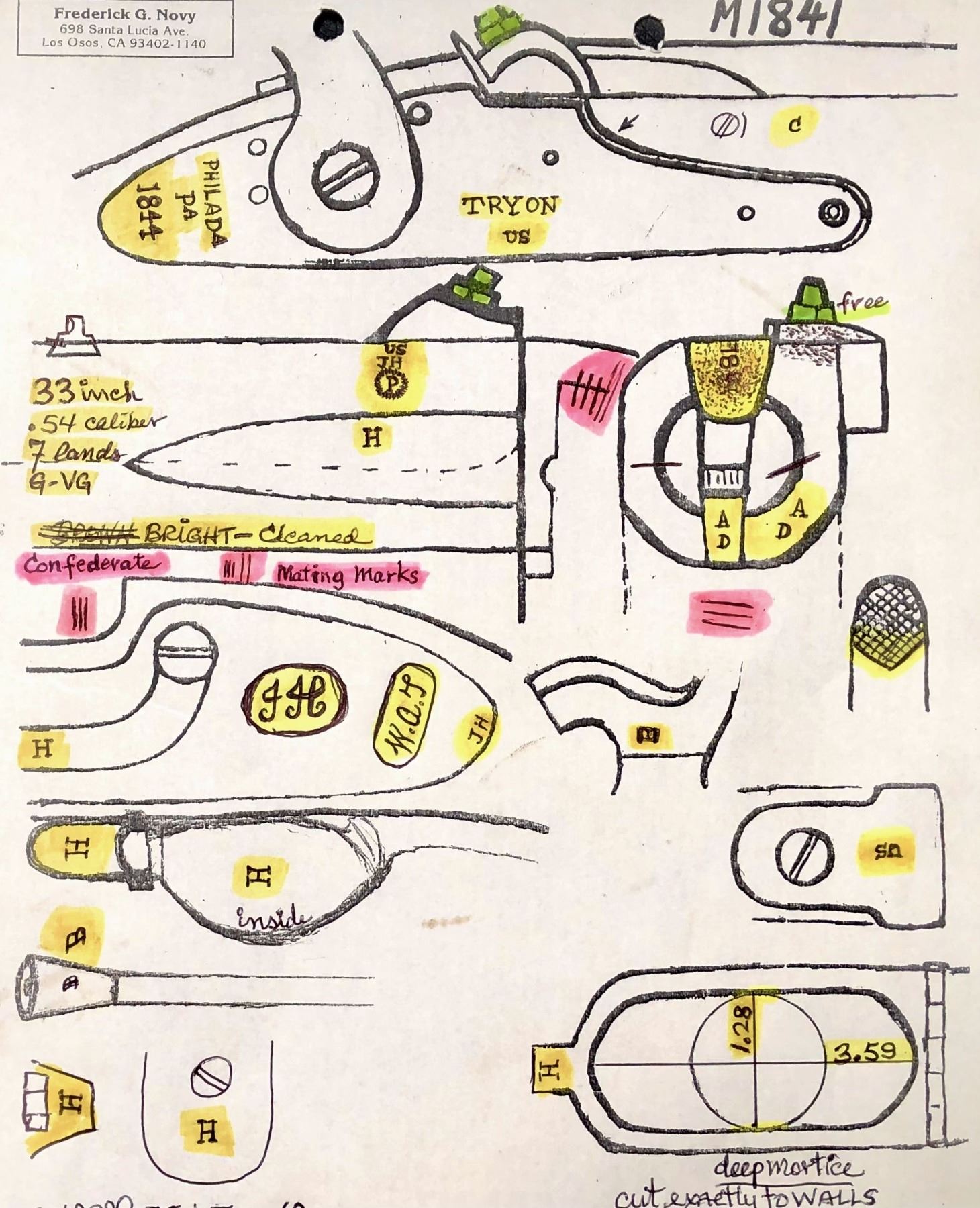 RIFLE. Cal. 55. NSN. Only 600 model 1841 rifles were delivered to US ordnance department in 1844. Many if not most went south and were thought used by Jefferson Davis in Mexican War. Only Whitney & Tryon delivered rifles in 1844. After Mexican War, many probably made their way back to Southern armories till the Civil War. This "untouched" original rifle is complete and matching and has matching assembly marks internally on stock, breech plug, & barrel. Dr. Frederick Novy states these are not M-1841 Tryon markings and believes they are Confederate C&R (cleaned & repaired) markings. This all makes total sense as C&R was being performed at Macon Armory on at least 25,000 arms and mostly rifles, and there is no known marking to designate the work. This is the rarest of all Mississippi government contract rifles. Rifle is in standard configuration of all government purchased 1841 rifles, 33 inch barrel, brass mounted, inspection initial "H" stamped on most every brass part, "US" surcharge on butt plate, "JH" & "WAT" inspection cartouches in stock opposite lock, "JH" & "US" inspection on breech of barrel. UNATTACHED ACCESSORIES: Dr. Frederick Novy notes and collection sheet. CONDITION: very good overall, good mechanics and good rifled bore, marking good with exception of worn barrel date with only "18" discerned. (01-26364/JS). ANTIQUE. $4,000-6,000.