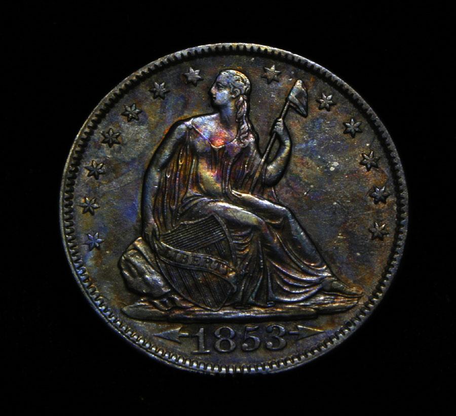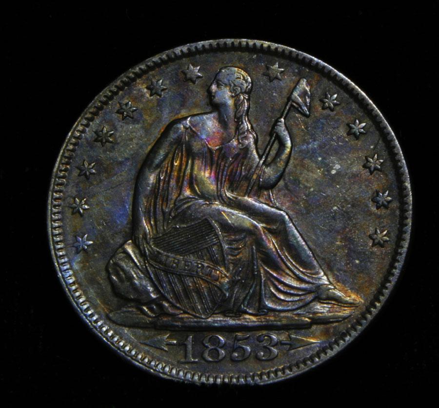 An amazing coin, Gorgeous All Original and Fully Gradable example. Deep colors, the colors and luster bouncing off the rays on the reverse are like a kaleidoscope. The 1853 is a one year type coin and necessary to complete a "Type Set" , so it is always in demand. Thus a steady and increasing vale for this issue. Coin World's Coin Values lists ms63 at $3500, ms60 is $1500 and ms62 is $2000. The Wholesale Greysheet lists ms63 at $2760 and ms60 is $1150. Estimated Value $3000