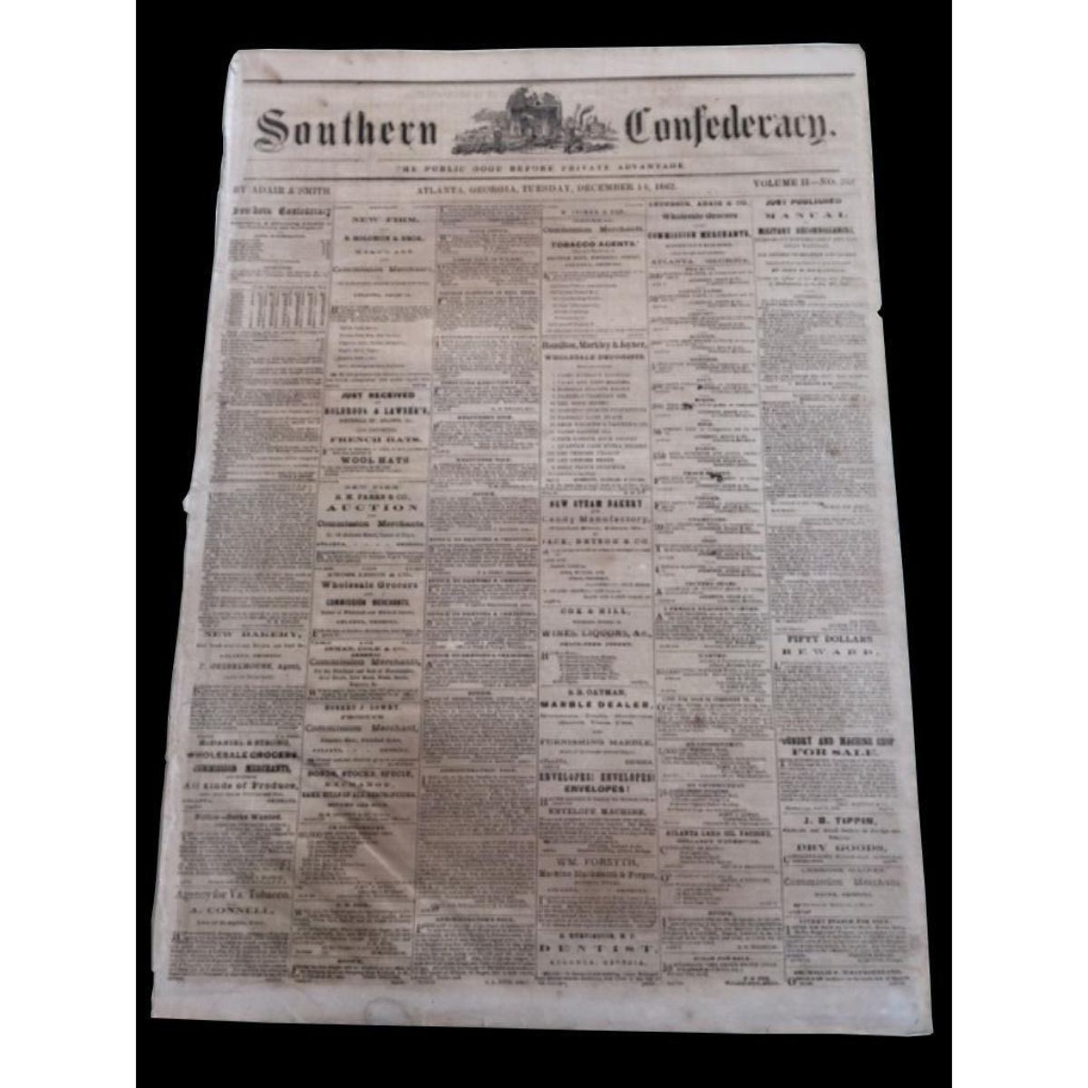 Extremely Rare Newspaper dated December 16, 1862. The "Southern Confederacy" was published daily ( except Mondays ) in Atlanta Georgia, by Hanleiter & Adair, from April 14, 1861 until it ceased publication in 1865. In good condition for age. Comes with archival sleeve.