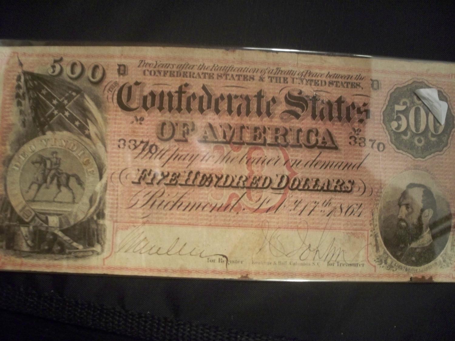 RARE 1864 $500 Confederate Note, has repaired tear top right corner about 2"