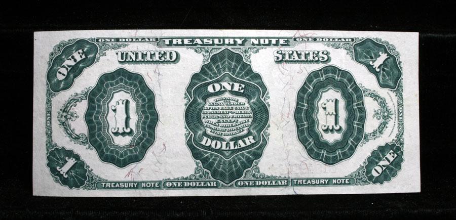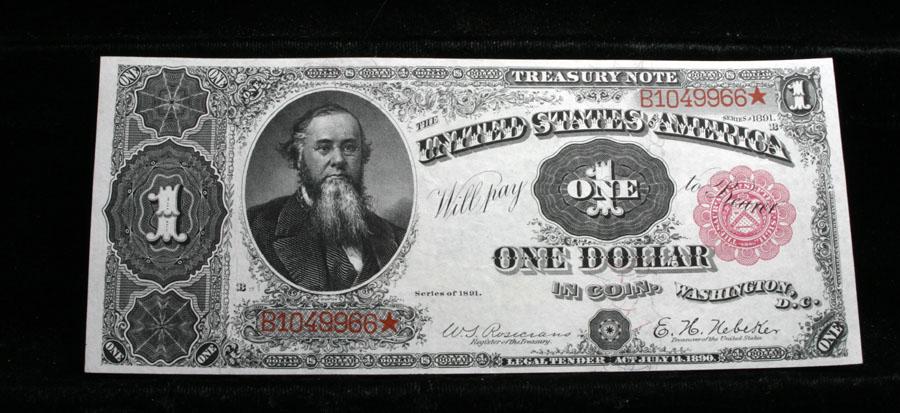 A highlight of the entire auction. This is an outstanding example of the 1891 Treasury note or "Coin Note". The note is bright, with nice red seals and serial numbers. The corners are sharp and the centering is excellent. Treasury Notes were only issued for 2 years, 1890 and 1891. Both issues depict Lincoln's Secretary of War Edward Stanton. The Treasury notes were called "coin Notes" because as opposed to gold or silver certificates, they could be redeemed for either. It was this uncertainty that led the government to quickly phase them out. Their initial entrance was due to a possible reduction or end to the minting of the Morgan silver Dollar. This Crisp Uncirculated note is estimated to grade GEM CU67, and the Wholesale Bluesheet lists GEM CU67 at $2750