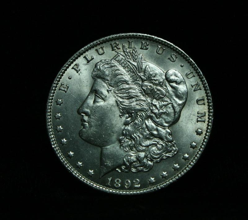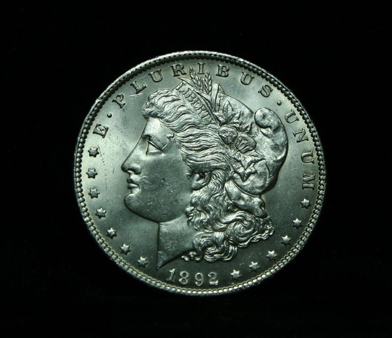 Blast White, Virtually mark free. A superb example. Strong Strike! This Coin is SCARCE in this Grade. Great Strike for the 1892-p, with BEAUTIFUL Luster. Total Mintage of 1,036,000. Lower mintage than 92-cc, 92-s, 91-cc, 94-s, and 75 other dates! Coin World's Coin Values lists ms64 at $1000 and The Wholesale Greysheet Value of ms64 at $825+. Estimated Value $850