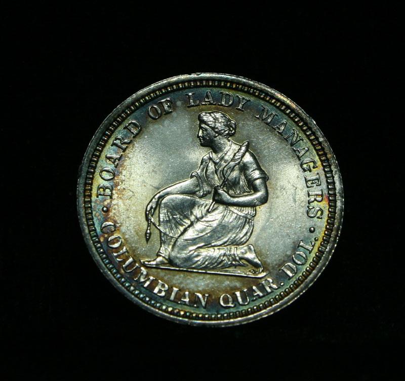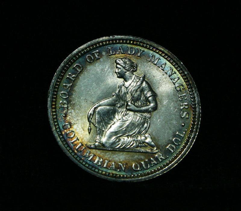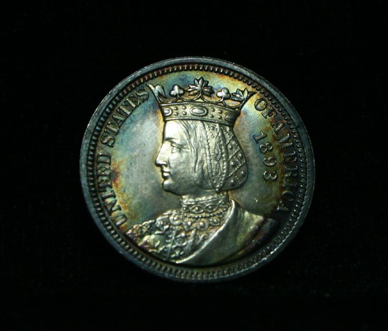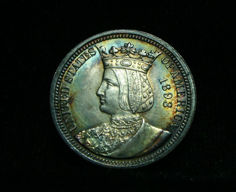 A spectacular Example of America's First Commemorative. It is Beautifully toned with colors ranging from yellow all the way to the deep blues. Beyond Exceptional Luster and fantastic Eye Appeal. When Examining an Isabella Quarter On the obverse, wear first shows in the area of the crown’s central oval jewel and on Isabella’s cheek. Reverse wear will first be noted on the strand of wool resting on the kneeling spinner’s thigh. Due to die wear, raised or sharp definition of the strand of wool is not the norm. This area can display a slight weakness of strike, which is par for the design and should not be labeled wear. Coin World's Coin Values lists ms65 at $2500, and The Wholesale Greysheet lists ms65 at $2200. Estimated Value $2250.
