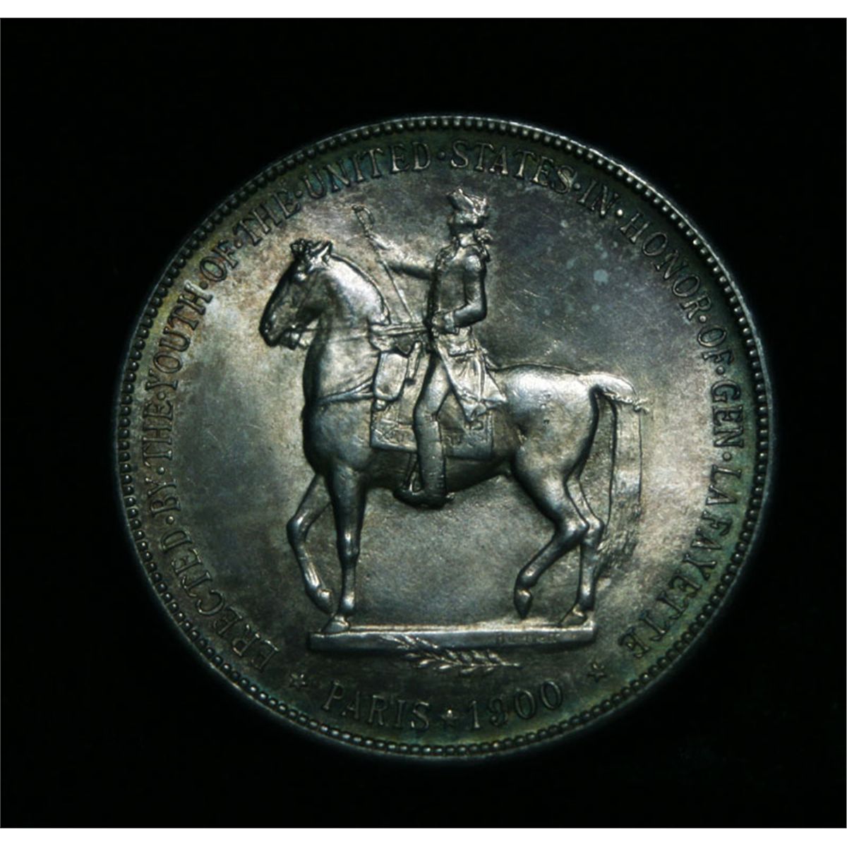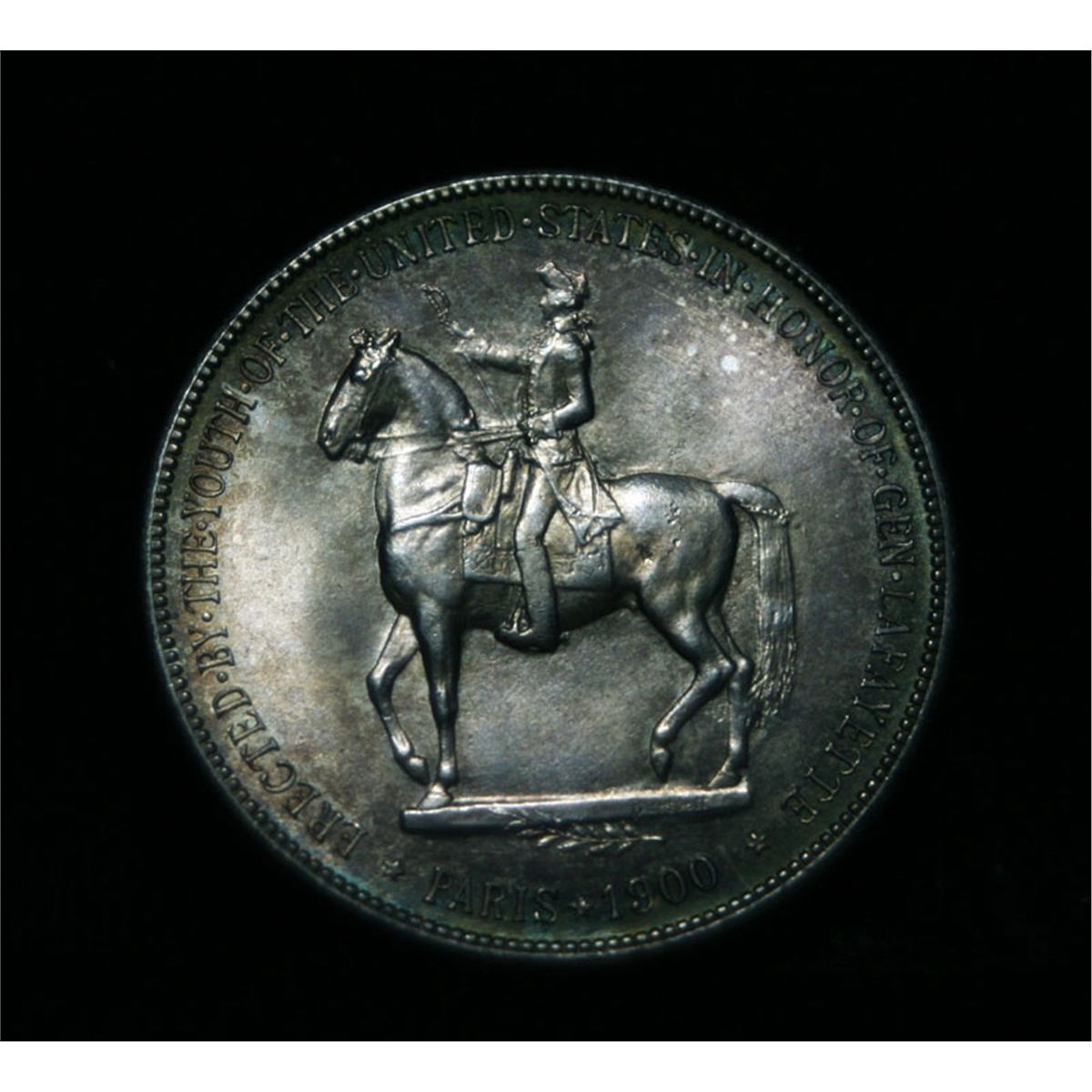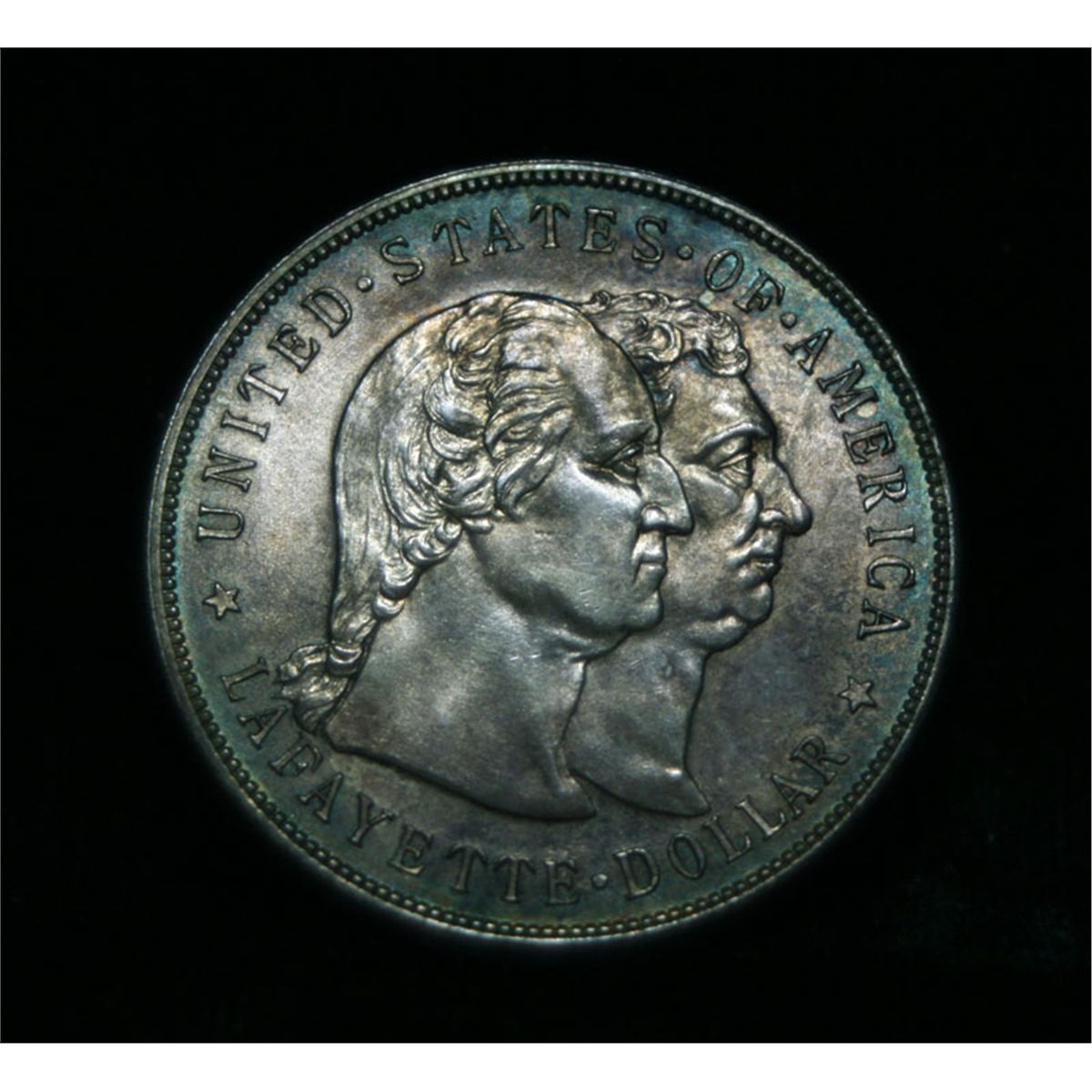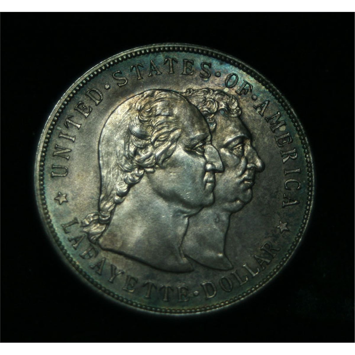 Very Attractive All Original, beautifully toned example. Terrific strong luster, minimal bag marks, good strike. A really great example of this tough Early Commemorative. Struck to commemorate General Lafayette and help cover the costs of a statue given by the US to the city of Paris. The coins were also to celebrate the Exposition in Paris in 1900. Also 1899 was the 100th anniversary of Washington's death When examining a Lafayette Dollar evidence of wear first appears on Washington's cheekbone and on Lafayette's lower curls. On the reverse, check the highest points of the design—the boot, thigh and rear leg of the horse. Also it is noted that This coin has a few Firsts, it is the first commemorative dollar ever struck, the first officially issued coin to depict a former President, and the first coin to show the same person (Lafayette) on both sides. NGC's Price Guide lists an ms64 at $3090 and The Wholesale Greysheet lists ms64 at $2830. Estimated Value $2900