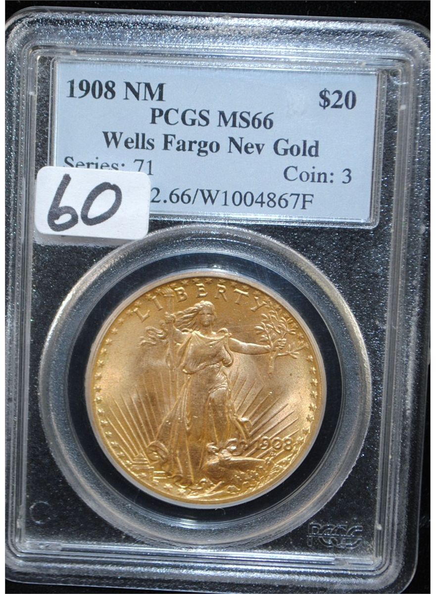 RARE 1908 $20 SAINT GAUDENS NO/MOTTO GOLD COIN - PCGS MS66 - "WELLS FARGO NEVADA GOLD PEDIGREE" - COIN WORLD LISTS A MS66 @ $3,250.00 - OF COURSE YOU HAVE TO FIND ONE FIRST!