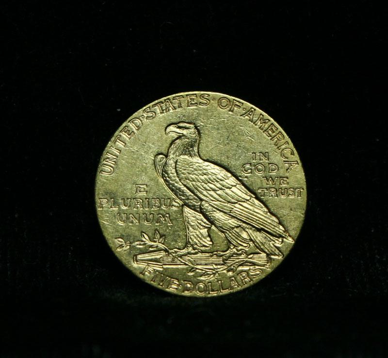 Very attractive example. Nice luster. Very attractive. The Incuse design of the $5 Indian initially spurred great uproar and many people claimed that the incuse design would trap dirt and spread disease. This is s nice example of this great coin. Coin World's Coin Values lists ms63 at $6000 and The Wholesale Greysheet lists ms63 at $4250 and ms64 at $14,250. Estimated Value $5000.