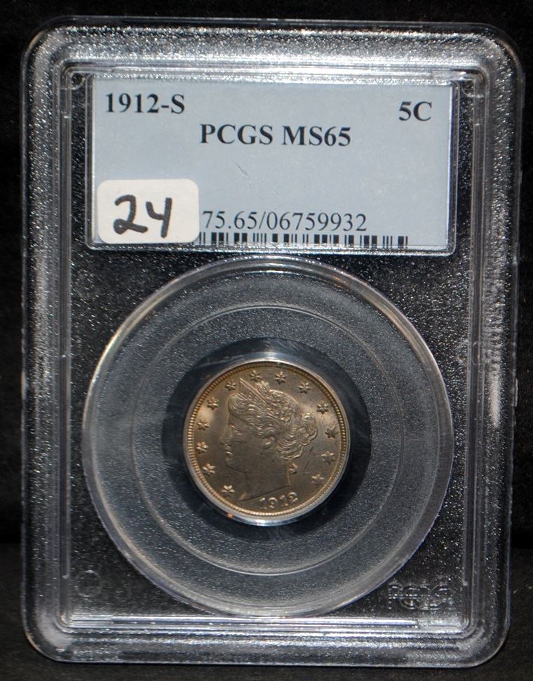 RARE 1912-S 5 CENTS LIBERTY HEAD - PCGS MS65 (THE CURRENT COIN WORLD TRENDS LISTS AN MS65 @ $4,500.00)