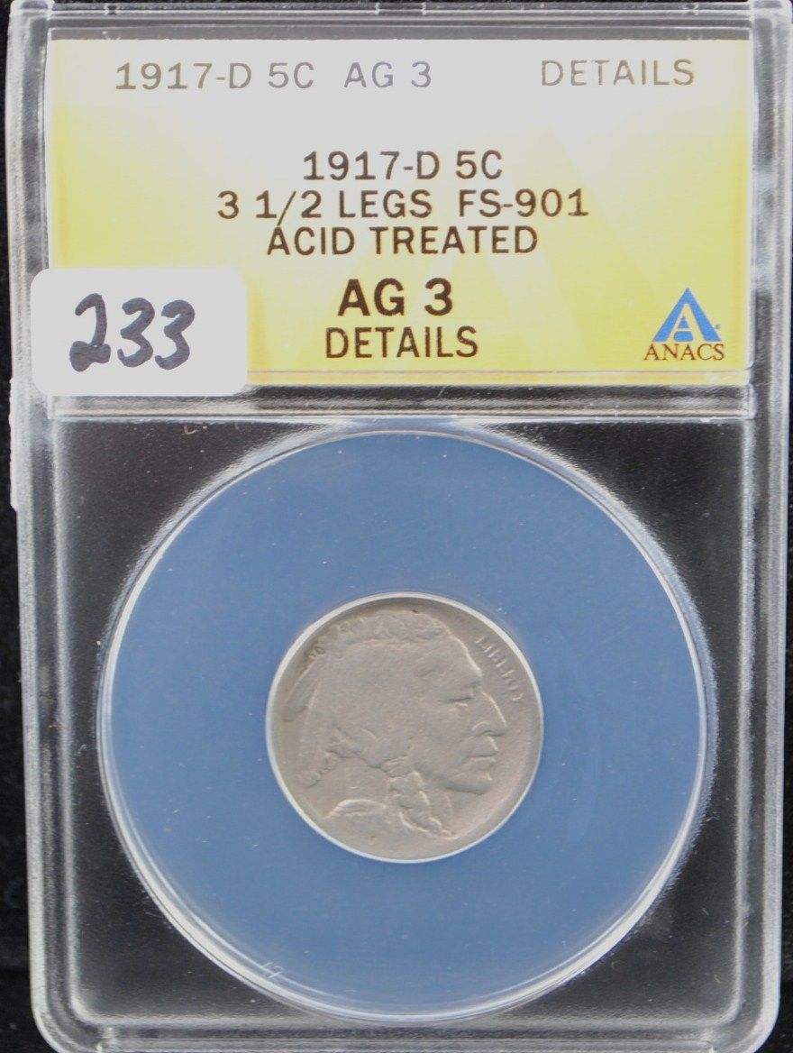 RARE 1917-D 3 1/2 LEGS BUFFALO NICKEL - ANACS AG3 - DETAILS (ACID TREATED)