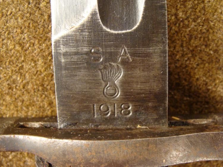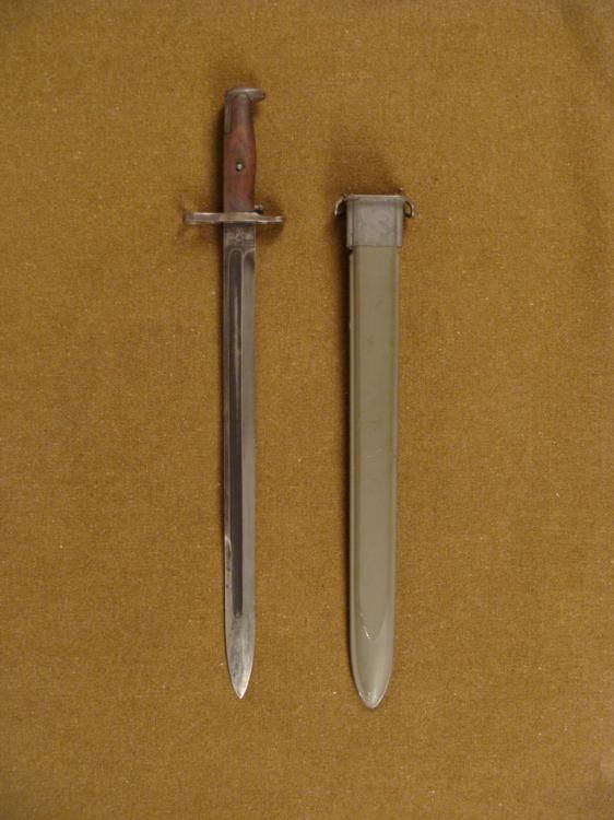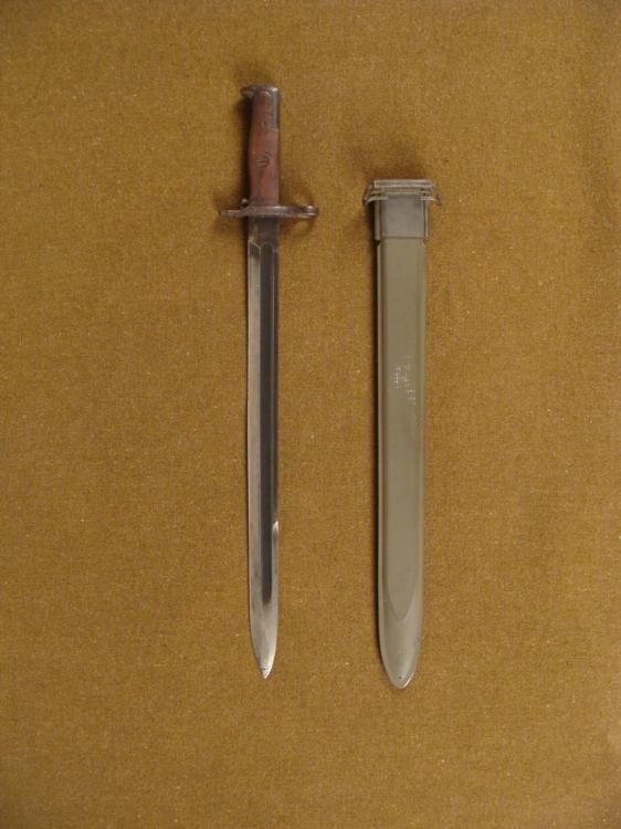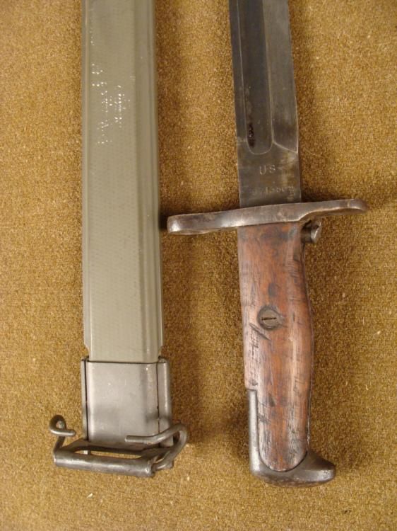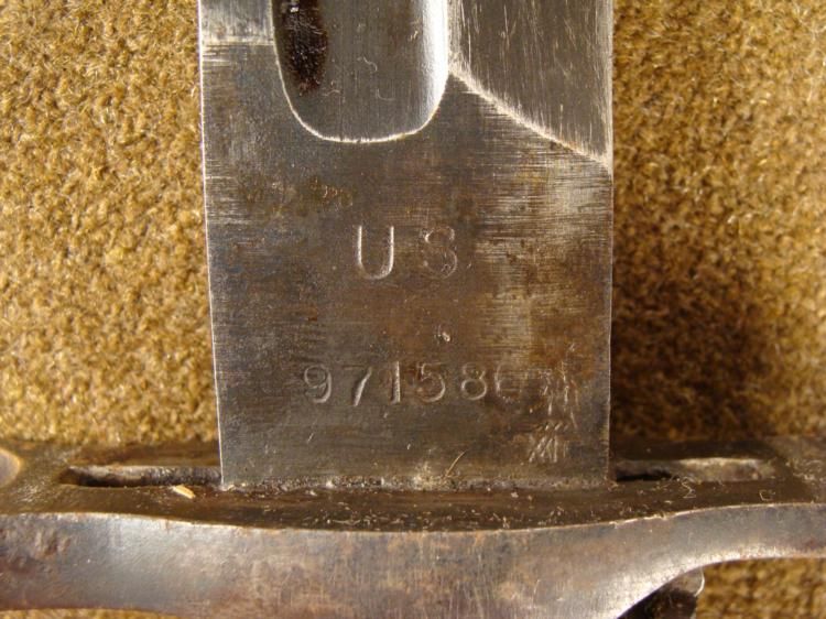 THIS RARE, 1918 UNCUT 16" BLADE ON THIS FIRST PRODUCTION PERIOD M1905 SPRINGFIELD ARSENAL BAYONET WITH SCABBARD IS FOR A 1903 & M1 RIFLE. IT HAS BLUED FITTINGS AND A BLADE WITH WALNUT GRIPS AND A EAGLE HEAD TYPE POMMEL. THE RELEASE BUTTON WORKS AND THE * RICASSO IS MARKED "S A 1918 W/FLAMING BOMB LOGO". ON THE REVERSE IT READS: "US-971586-& AN EAGLE HEAD OVER #-XXI". THIS IS A NICE FULL LENGTH SCABBARD WITH "US" ON FLAMING BOMB ON THE TOP METAL FITTING. THE OVERALL LENGTH IS 20 1/2", THE BLADE IS 16", AND * THE FULLER IS 12"