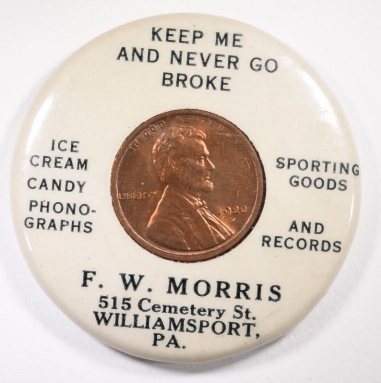 RARE! 1920-D LINCOLN CENT GEM BU+ FULL RED AND ENCLOSED IN A "LUCKY PENNY KEEP ME AND NEVER GO BROKE" ADVERTISING PIN FROM F.W. MORRIS, WILLIAMSPORT, PA. COIN IS NOT DAMAGED IN ANY WAY AND CAN BE REMOVED EASILY.