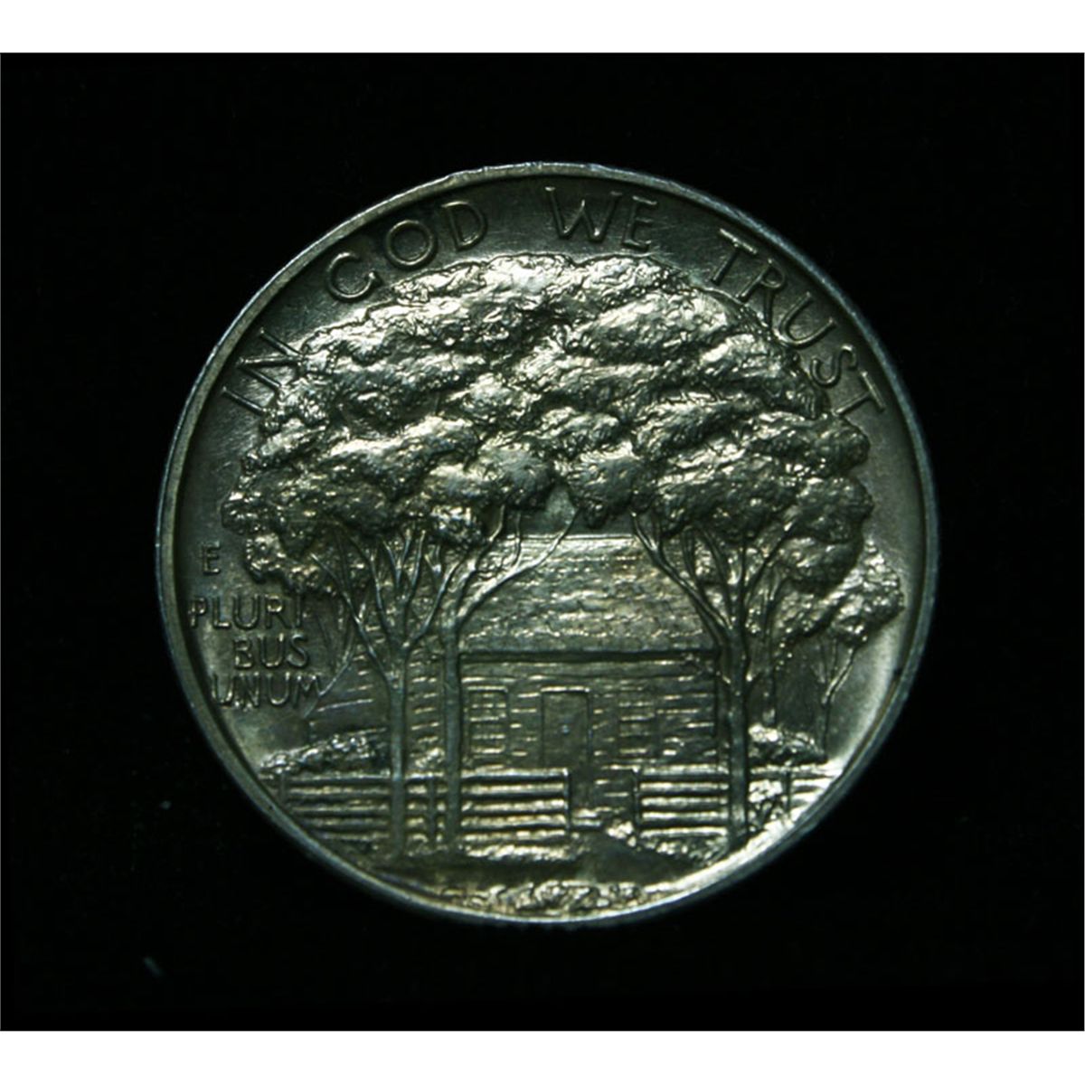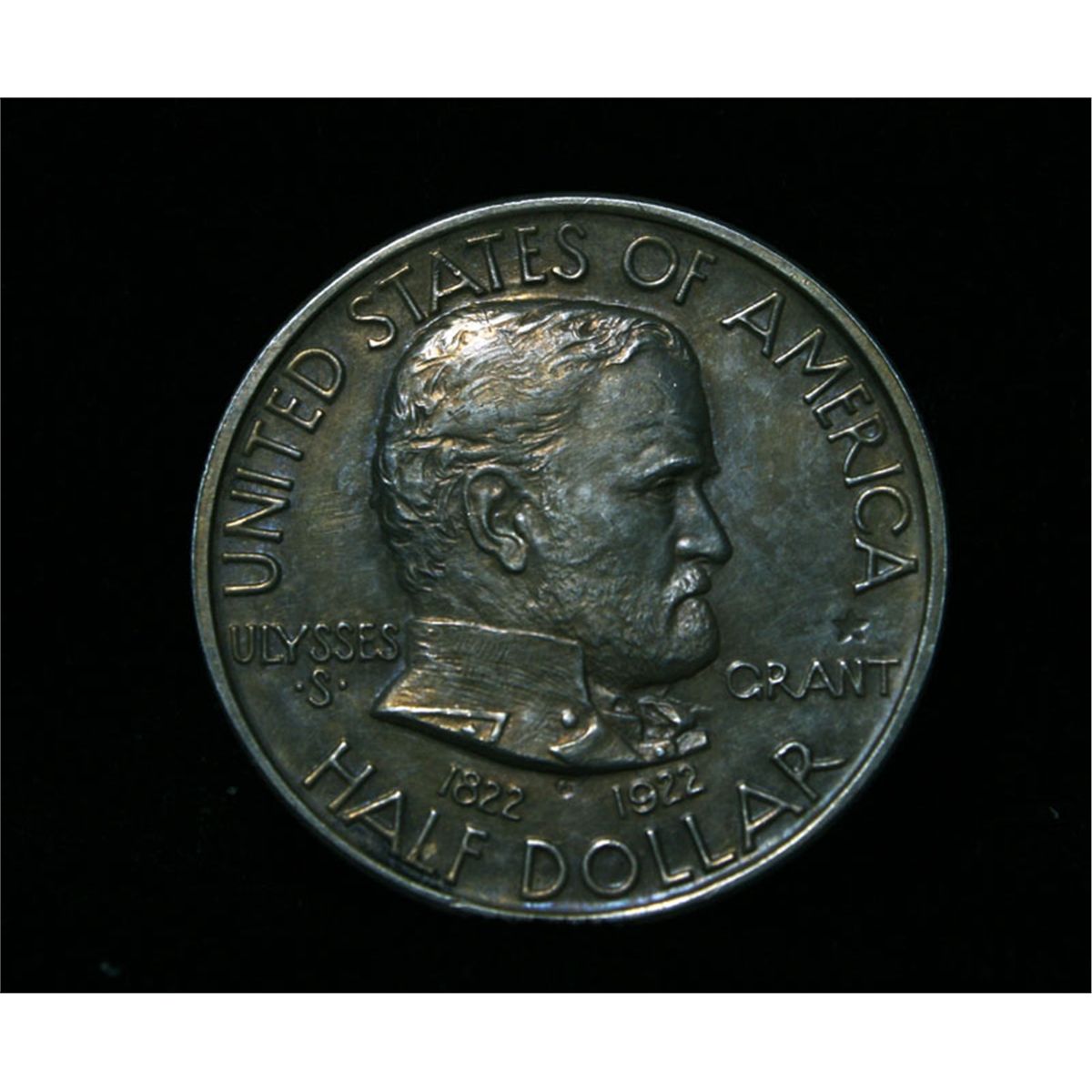 This is one of the Keys to the entire Silver Commemorative series. Less than 5% of the Grant Commemoratives were made with the star variety. This example is nicely toned with a good strike. The Grant halves are notoriously difficult to grade, partly because raised die lines on the obverse look at first glance like hairlines or scratches. Points to check for wear include Grant’s cheek and the hair above his ear. The reverse’s dense design tends to mask imperfections and wear, but light friction often can be detected in the treetops. NGC's Price Guide lists ms63 at $1800 and ms64 at $3000+. The Wholesale Greysheet lists ms63 at $1420 and ms64 at $2750. Estimated Value $2000