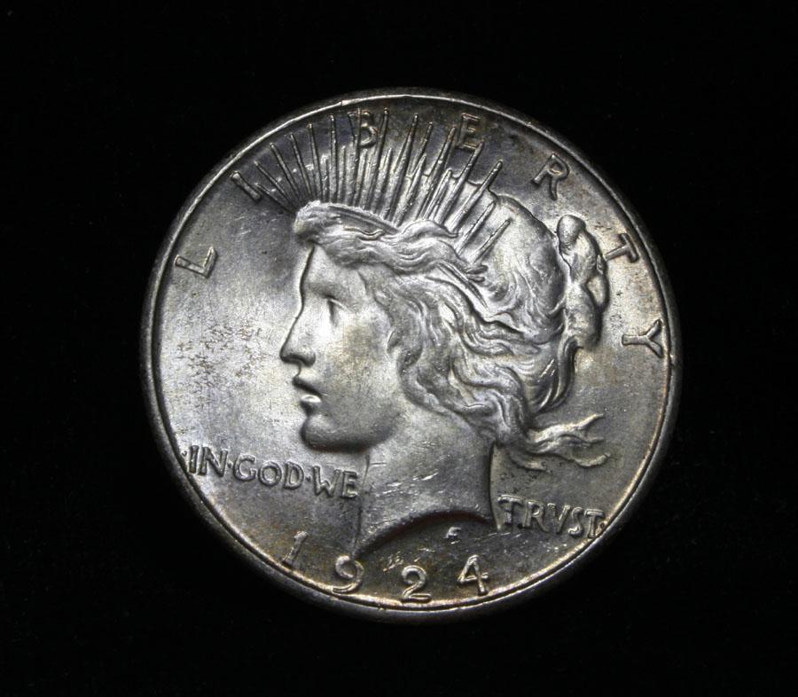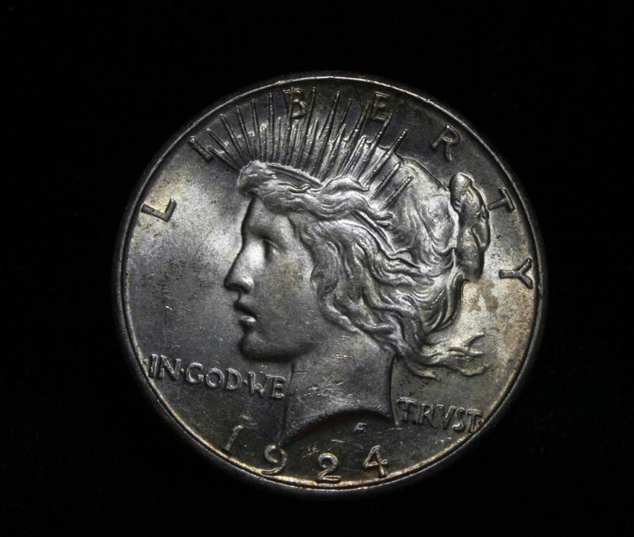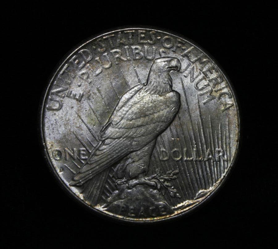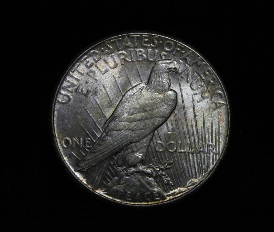 Vastly superior eye appeal, with terrific pastel colors, look t the pictures. It is also a lustrous example, with a good strike. The 24-s generally has a "mushy" strike, this example does not. A great example of a key date Peace Dollar. Coin World's Coin Values lists ms64 at $1500 and The Wholesale Greysheet lists ms64 at $1150. Estimated Value $1250