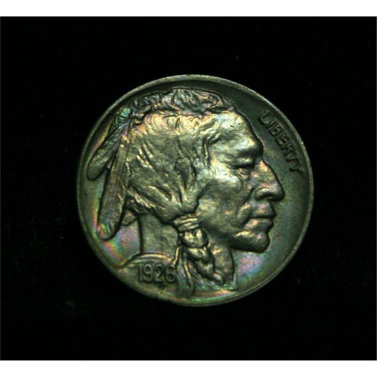 AUCTION HIGHLIGHT First, for those unfamiliar with the 1926-d Buffalo, it is the poorest struck Buffalo in the entire series. It is noted in R. S. Yeoman’s "A Guide Book of United States Coins", that the 1926-d is the hardest date to find fully struck. Almost all have no 3 dimensional horn and many have no horn at all. As a second source Quoting Q. David Bowers right off of the PCGS Price Guide home page for Buffalo Nickels : " Indeed, certain issues of the Denver and San Francisco mints in the 1920s are nearly always weakly struck, with 1926-D being particularly egregious in this regard." That being said, this example is "FULLY STRUCK" It has a wonderful strike. Strong horn and head of the buffalo. Dynamite Obverse as well. Besides the almost unheard of Full Strike it has wonderful colorful toning. It has superior eye appeal and is in my opinion one of the best if not the best struck 26-d I have ever seen let alone auctioned. The Wholesale Greysheet lists an average struck ms65 at $3650. Estimated Value $5000