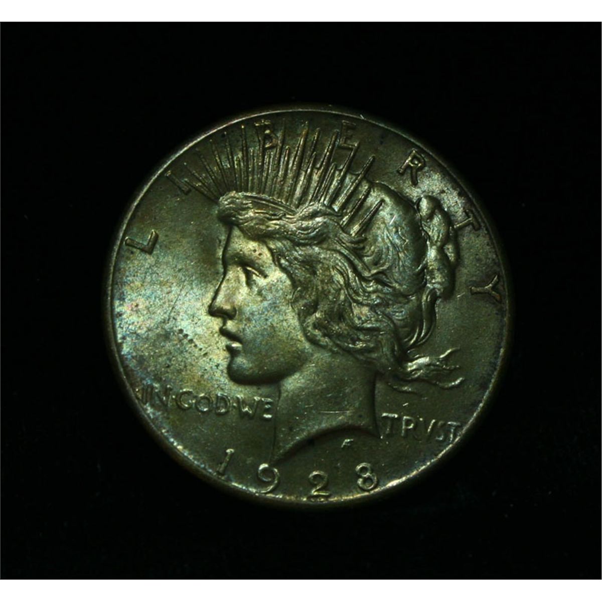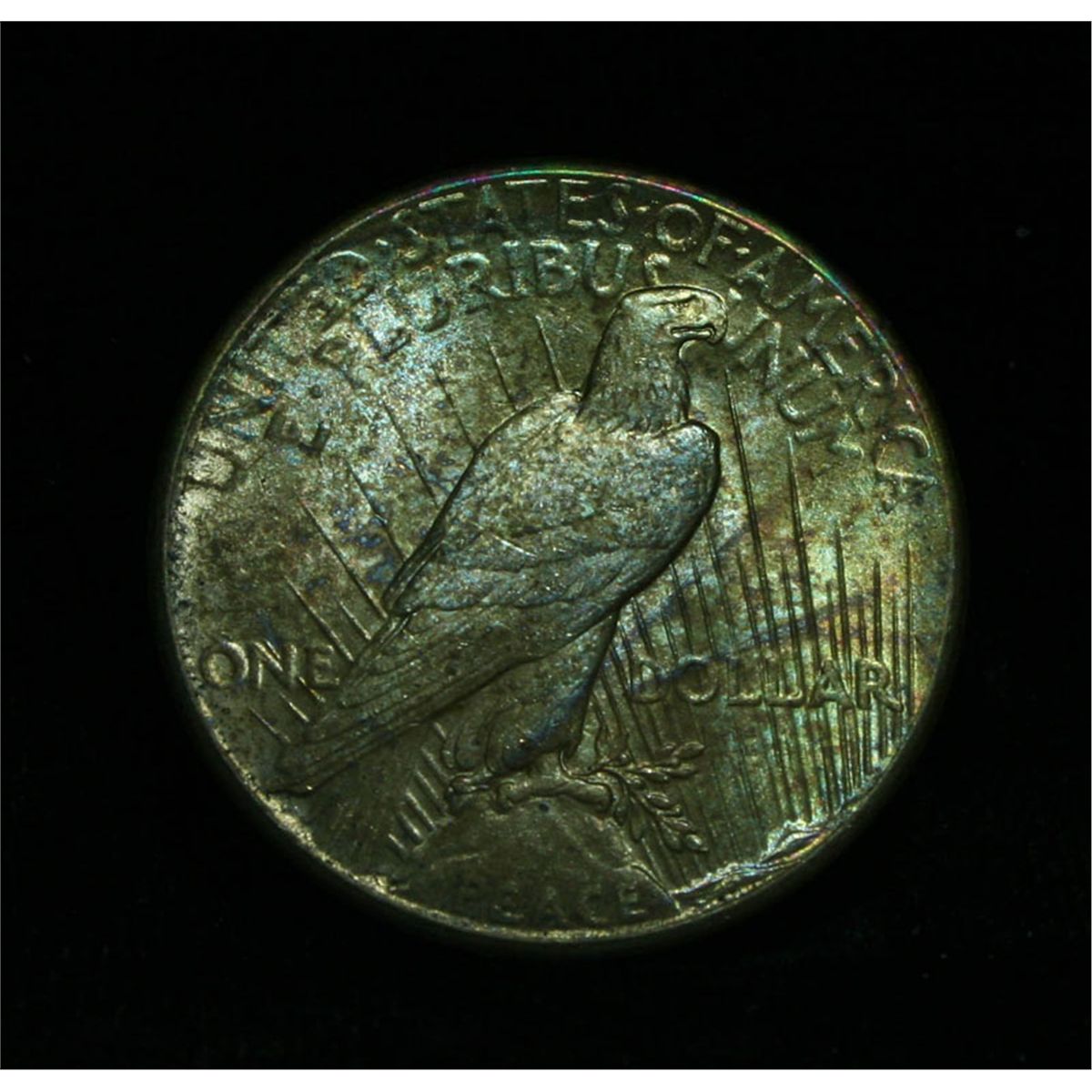 The KEY date to the Peace Dollar Series and it is Nicely Toned with greens, golds and bronzes. Great Luster. Beautiful Color and Very Pleasing to the Eye. NGC's Price Guide lists an ms64 at $1240+ and an ms65 at $4130+. The Wholesale Greysheet lists an ms64 at $1025 and an ms65 at $3500. Estimated Value $2000.