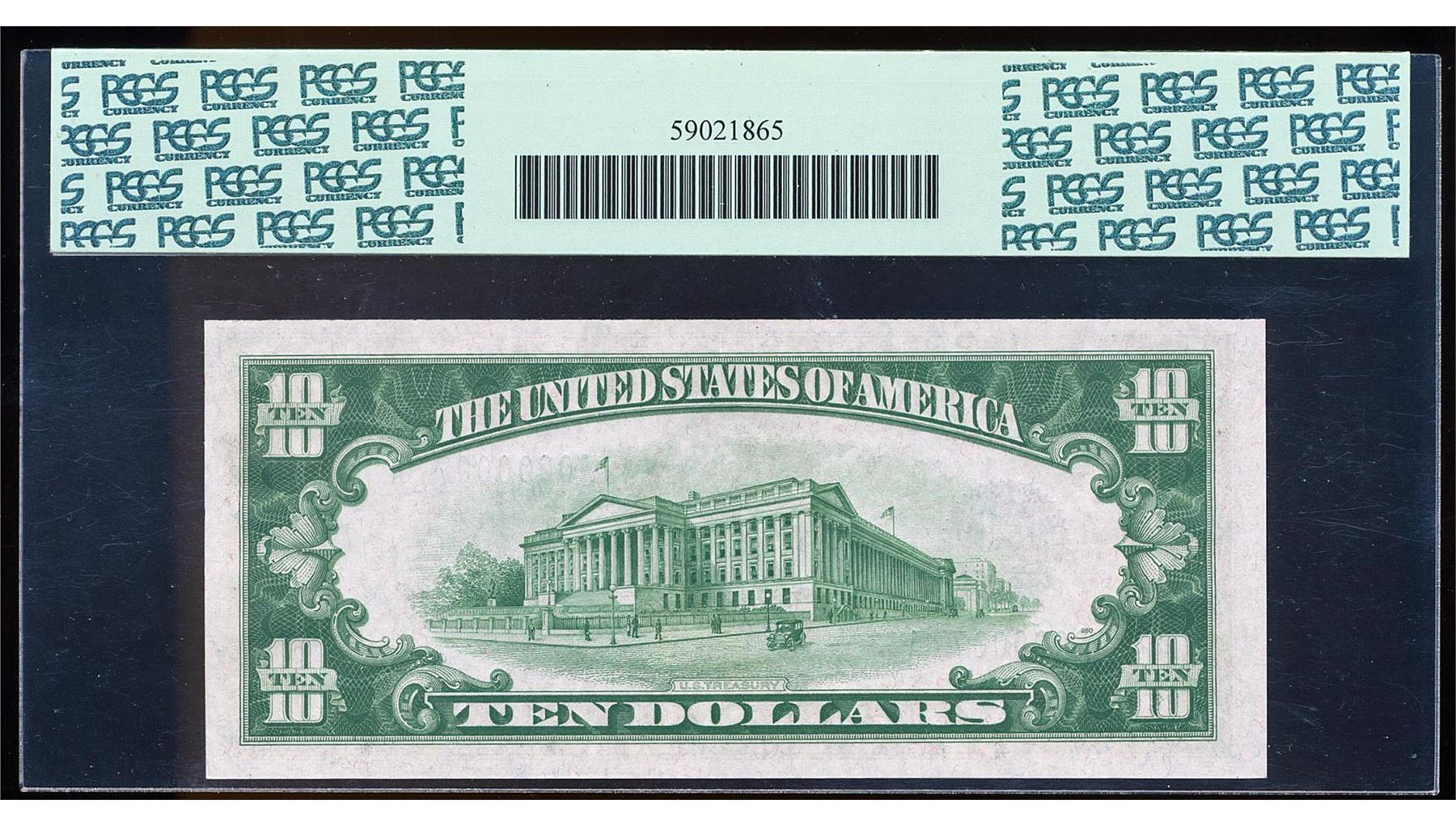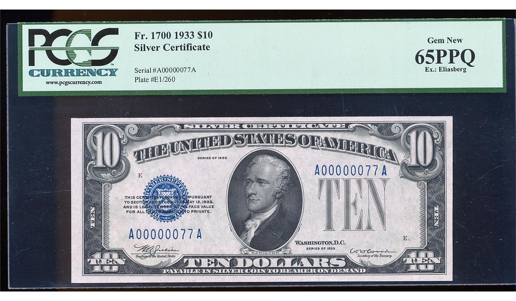 RARE - 1933 $10 Silver Certificate Note Fr.1700 PCGS Graded Gem New 65PPQ. This catalog number represents a note that is often referred to as "The King of Small Size," as every dedicated collector of bills of the current dimensions aspire to eventually own one of these rarities. The note is seen with a highly impressive serial number of A00000077A and exhibits deep embossing, sharp corners & pleasing margins as expected in this high grade. This series differs from the far more common 1934 series notes with a Treasury seal at left and the absence of a blue 10 counter. Also the wording PAYABLE IN SILVER COIN TO THE BEARER ON DEMAND as seen on this note was reworded to IN SILVER PAYABLE TO THE BEARER ON DEMAND for the later issues. When these note escape the market into collections, they typically will be tightly held and not turn up for several years if not decades. PCGS Graded.