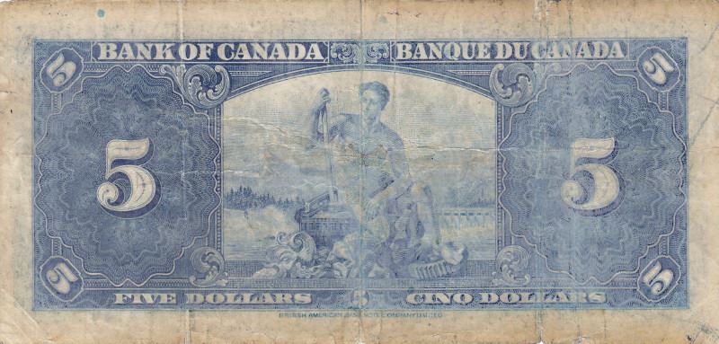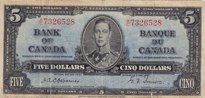 1937 Bank of Canada $5 Bank Note - RARE Osborne Signature - VG+ Condition - A/C Series