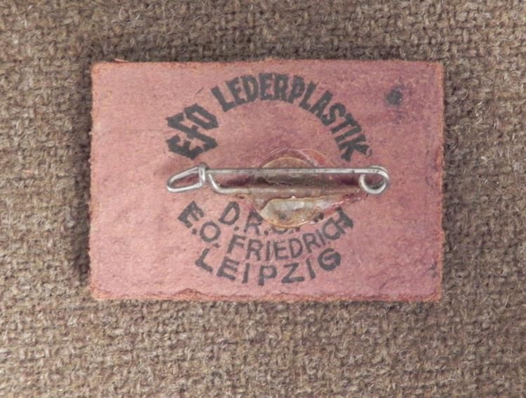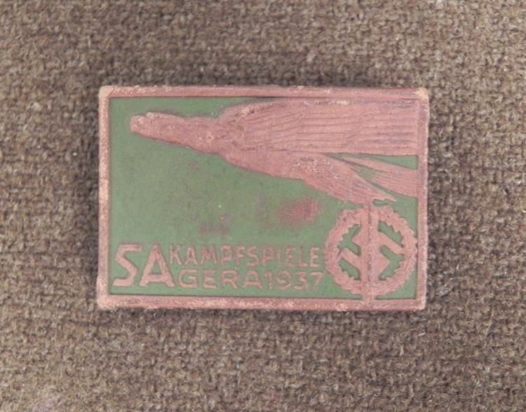 RARE 1937 NAZI STORMTROOPER SPORTS GAMES BADGE-ORIG-WELL MARKED RARE BADGE--FRONT HAS A FLYING EAGLE THAT IS STYLEIZED CLUTCHING A WREATH AND SWASTIKA WITH THE SA SPORT SWORD AND READS "SA--KAMPESPIELE GERA 1937"--REVERSE IS STAMPED "EFO LEDERPLASTIK DRGM