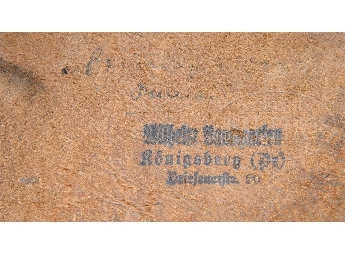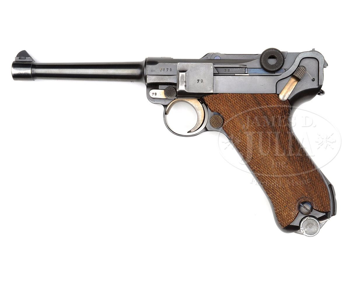 SN 5879v. 9mm/120mm bbl. "1938" marked above chamber. "Mauser Banner" with 6/6 staves on center toggle link (Pictured on p. 748 of Dr. Geoffrey Sturgess' The Borchardt & Luger Automatic Pistols) and a Crown/Crown/U proof on receiver. "Geladen" marked on extractor. Internal numbers are matching except for left grip which is serial number 50. Aluminum bottom magazine marked “9mm” is unnumbered. With an orig dark brown Swedish Trials holster made for the longer barrel ink stamped "Wilhelm Baumgarten / Konigsberg (Pr)/Briefeuerstr. 20" inside the flap. Holster has pull strap and upstrap closure and pouch for an extra magazine which has an extra aluminum bottom magazine in it. Holster is shown on p. 1225 of Sturgess book. This rig is an excellent complete original example of a rare variation Luger. PROVENANCE: Collection of Dr. Geoffrey Sturgess. CONDITION: Excellent. Retains 98% original blue and 95% original straw. Grips show nice wood grain and have sharp checkering with a few minor indentations. Bore is bright and sharp. Magazines are excellent. Mechanically sound. Holster is in very good condition with light scuffs and minor cracking and flaking in the curvature of the flap. Closure strap is wrinkled and flaking from use. 4-52889 BWS1