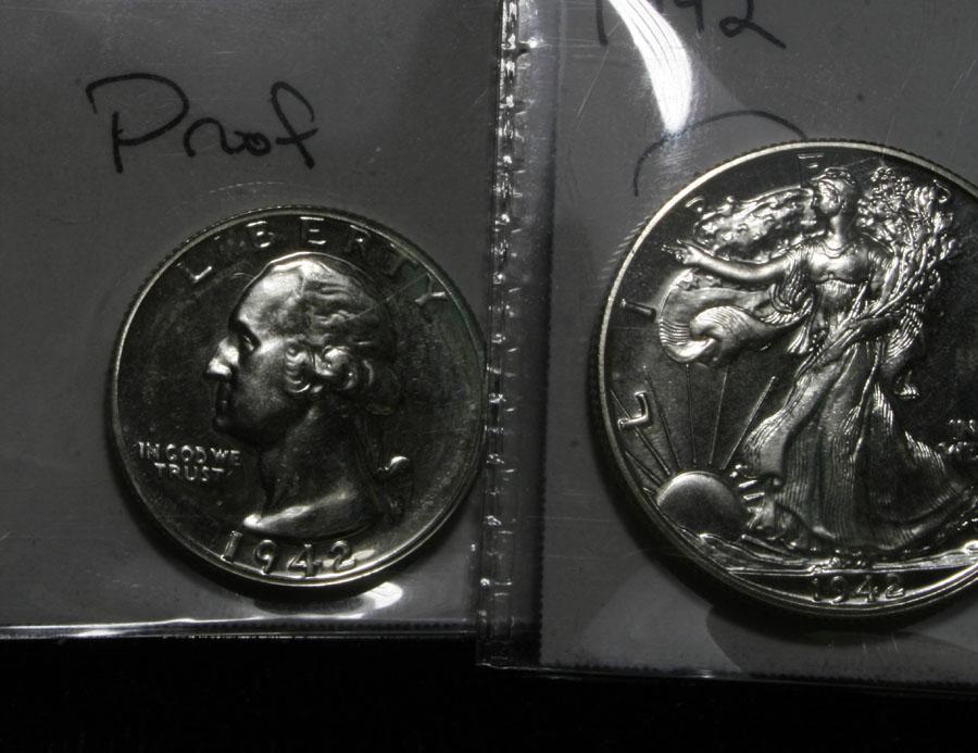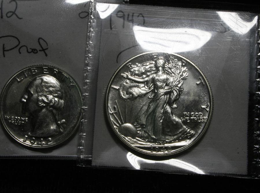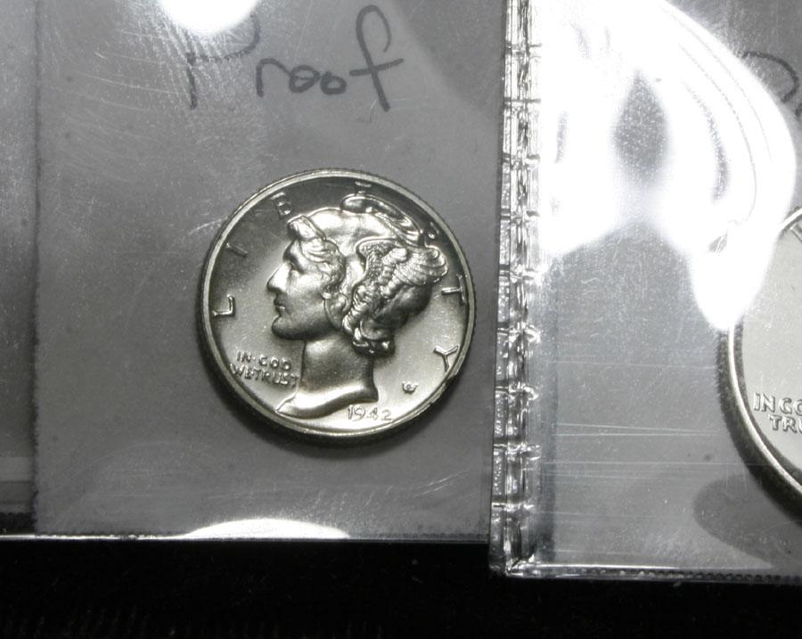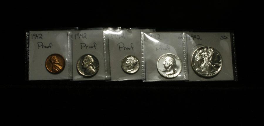 This is a rare 1942 Proof Set. Only 21k sets were ever made. The set includes a Lincoln set, Jefferson Nickel, Washington Quarter, and the highlights, the Proof Liberty Head 'Mercury' Dime, and the Proof Walking Liberty Half Dollar. Coin World's Coin Values lists a 1942 Proof Set at $1200-1500 and The Wholesale Greysheet lists a 1942 Proof Set at $1025. Estimated Value $1100.
