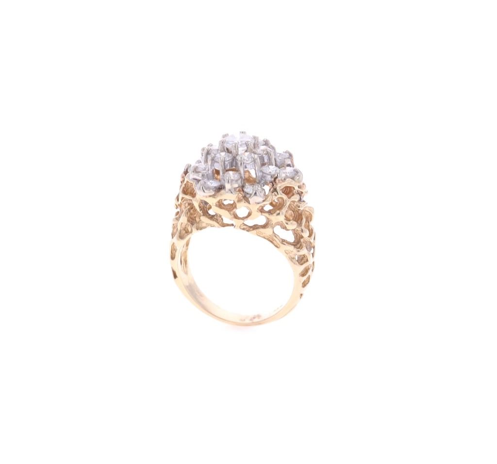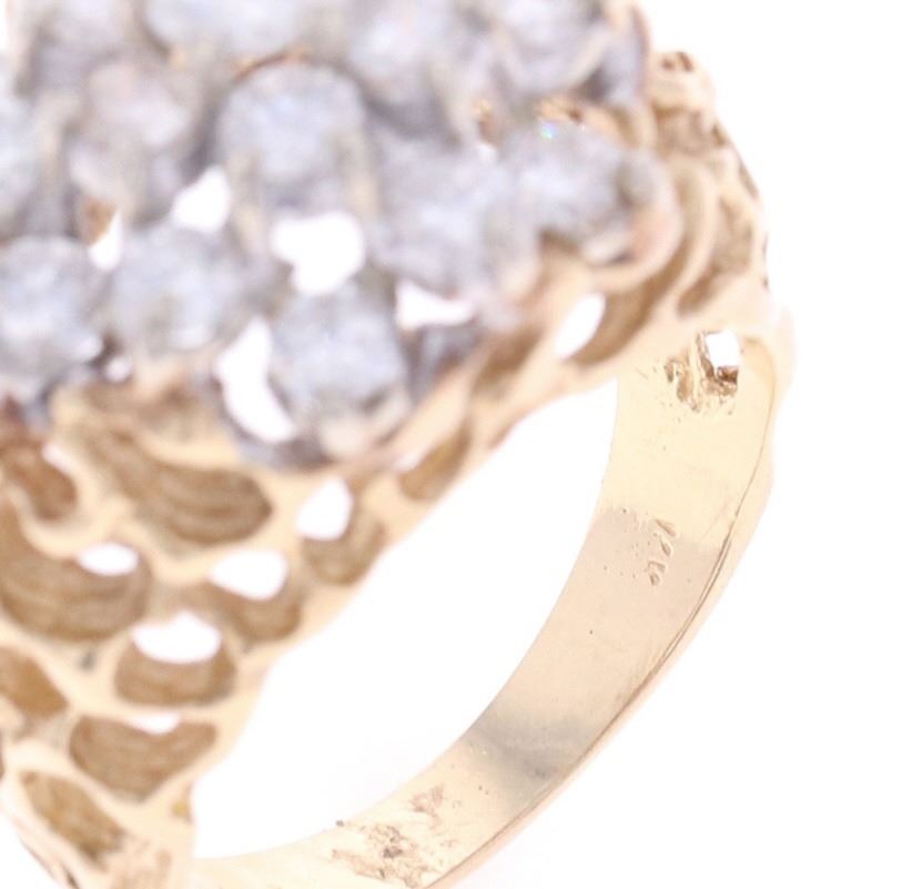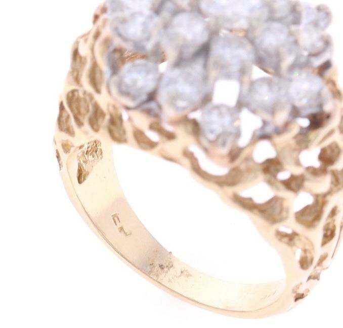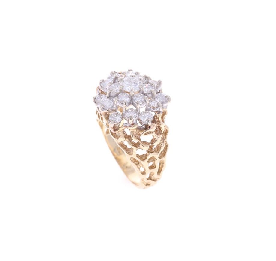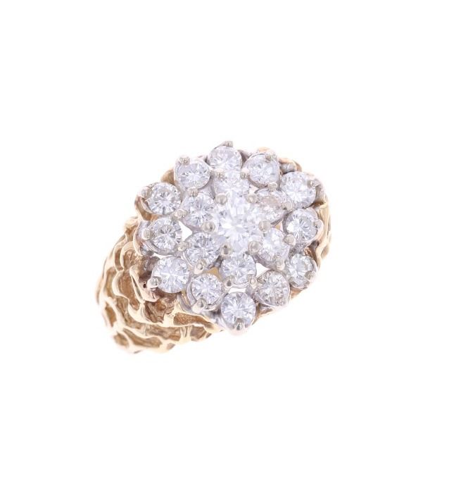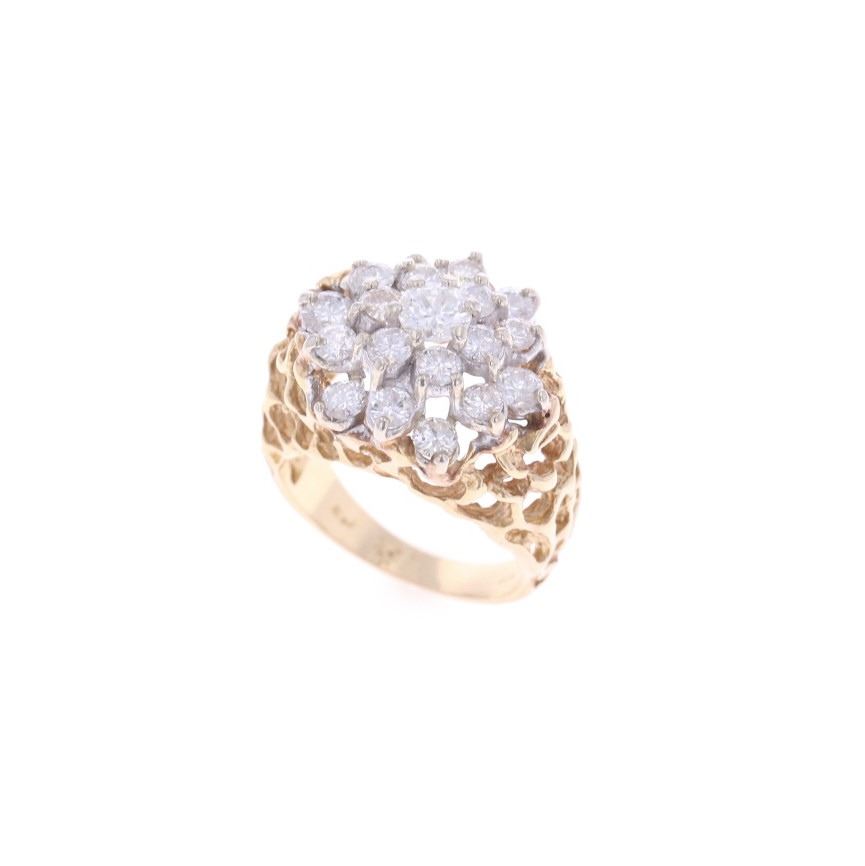 Featured in this lot is a 2.77ct cluster diamond and 14k yellow gold ring circa 1950s-1960s with AIGL paperwork. The ring features a stamped, polished, and tested 14k gold construction that is marked 'CP' and '14k' on the inside of the ring band. The center stone is a natural round brilliant cut diamond that shows 4.8mm measurements and shows a clarity of SI2 and a color gradient of E with a total weight of 0.40 carats. The center stone is clustered with a total of 18 round brilliant cut diamonds with measurements of 3mm and shows a clarity of SI1-SI2 with a color gradient of E-F and a total weight of 2.37 carats. The total diamond weight is 2.77 carats. The piece comes complete with AIGL Inc.(American International Gemological Laboratories, Inc. a GIA certified lab AIGL#: K42D98-EA18824) report and appraisal confirming the above info and giving a total value of $12,983.00. The ring size is US 6 1/4. RN035001*