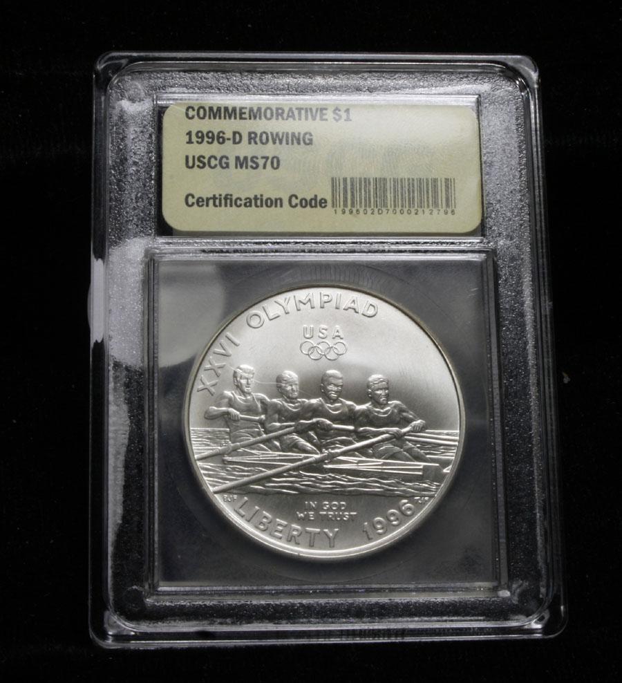 The 6 Uncirculated Olympic Commemoratives from 1996 are the hardest and most sought after Modern Silver Commemoratives. Extremely low mintage. 3rd most Valuable Commemorative. The 1996 Rowing Silver Dollar was issued was part of an extensive program of commemorative coins for the XXVI Olympiad held in Atlanta, Georgia. There were a total of sixteen different coins issued for the program over the course of two years. PCGS lists an ms70 at $850 and an ms69 at $370. Greysheet lists wholesale for an ungraded example at $270. This Perfect coin is graded ms70 by USCG. Estimated Value $550.