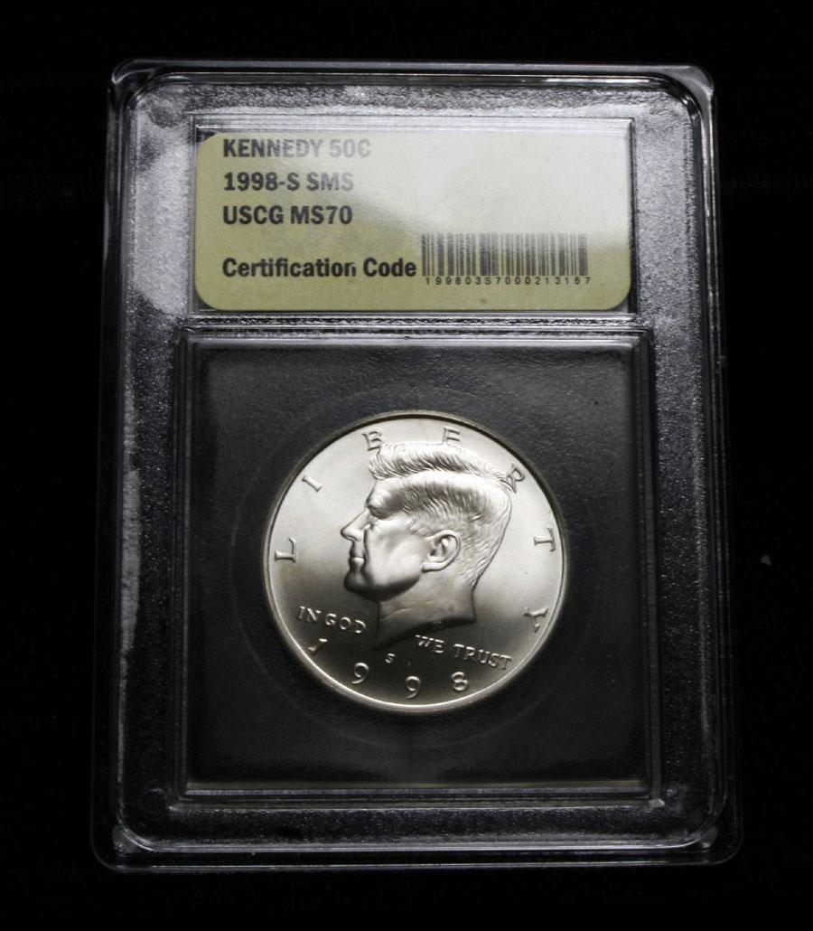 We have it here the Key to the entire Kennedy Half Dollar Collection, The Ultra Rare 1998-s, Only available in the Special 2PC Mint Set. This is a virtual Perfect Example, it is Graded ms70 by USCG and it is Encapsulated and Sonically sealed for its protection. A real difficult coin. PCGS has Graded 1 of every 13 coins received for grading ms70. PCGS Lists an ms70 at $800 Coin World's Coin Values lists ms67 at $300, Estimated Value $650