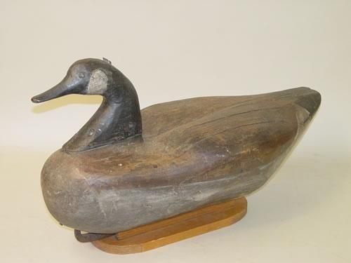 RARE 19TH CENT. CANADA GOOSE DECOY-CARVED & PAINTED WOOD W/ CUSTOM WOODEN DISPLAY STAND (14 1/2" T X 23" L X 11" W) - WEAR TO PAINT, BODY CRACKS, IMPERFECTIONS