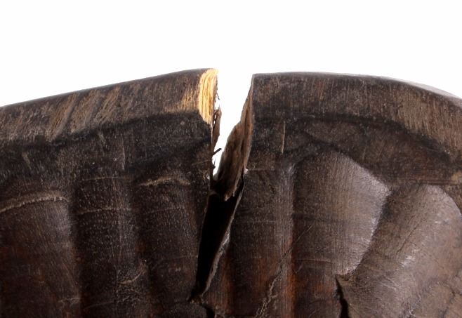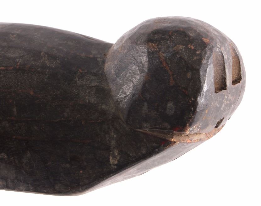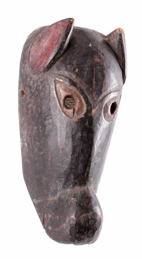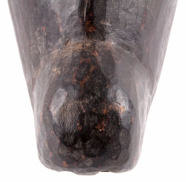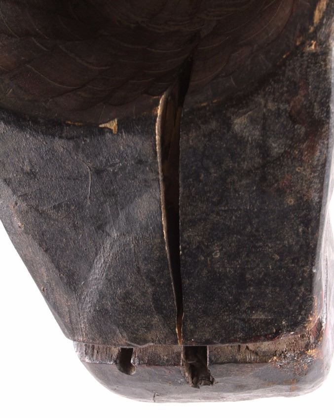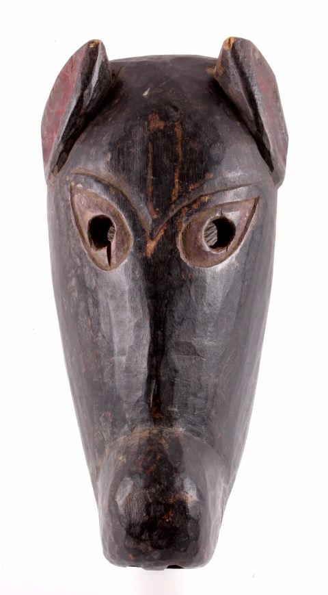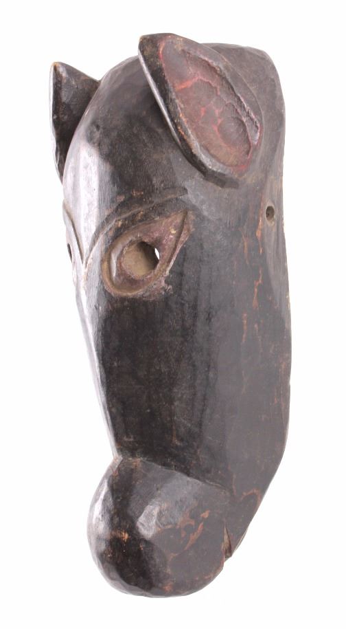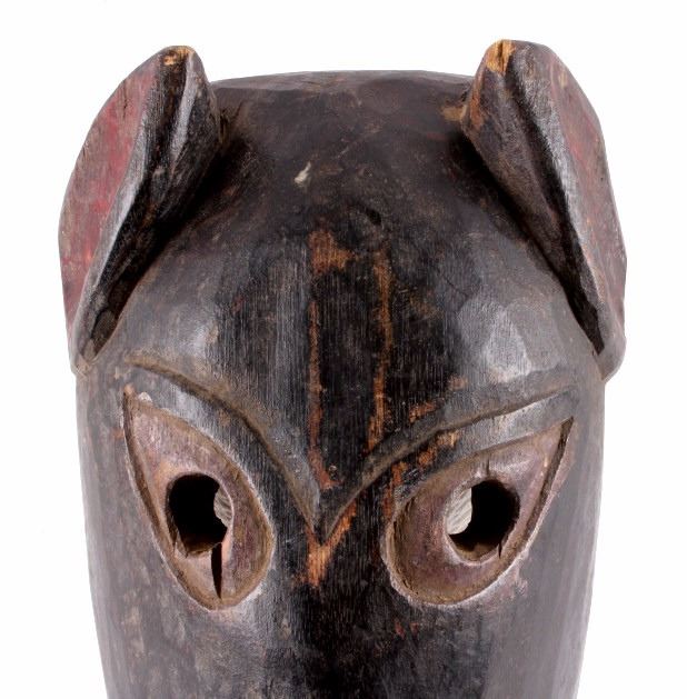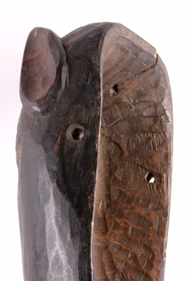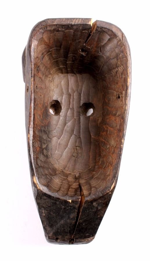 This is a rare Haida carved wooden wolf mask from the 19th century. The mask was hand carved from solid wood. Most often, these masks were used by members of secret societies in their dances in which they believed they were possessed by the spirit of the being represented by the mask. This mask shows good overall condition. There are two minor splits in the wood on the back of the mask as shown. The mask measures 6" x 12".
