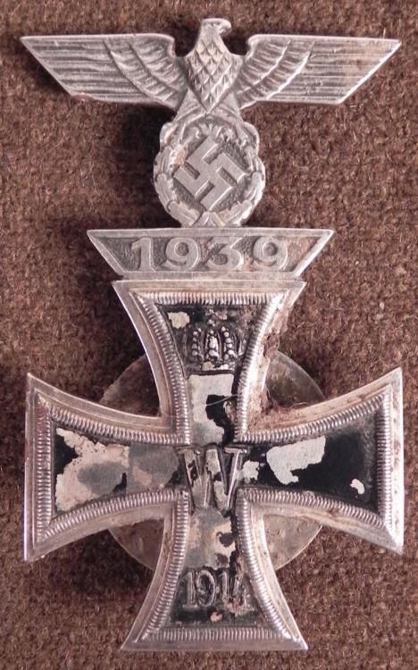 RARE 1ST CLASS NAZI 1939 BAR OVER 1ST CLASS 1914 IRON CROSS ONE PIECE ORIG * NAZI 1939 EK BAR WITH EK 1914 WWI IRON CROSS-VERY HARD TO COME BY ONE PIECE CONSTRUCTION-EK HAS SCREW BACK AND BAR HAS A UNIFORM CLIP ON BACK- SHOWS MUCH AGE & REVERSE HAS SOME RUST & METAL LIFTING *