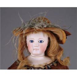 RARE 20” FRENCH FASHION. A magnificent Fashion with a cup and saucer style neck. This extremely pale bisque, blue-eyed (reset) with finely detailed facial features is on a bisque shoulder plate affixed upon a gusseted kid body. Wearing an antique brown dress and black leather boots but has a replacement sandy-brown human hair wig. CONDITION: Some black speckling to face. Clothing shows some distressing/melting. Kid body overall in good shape. JL 1-2083