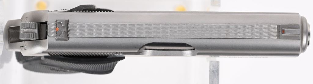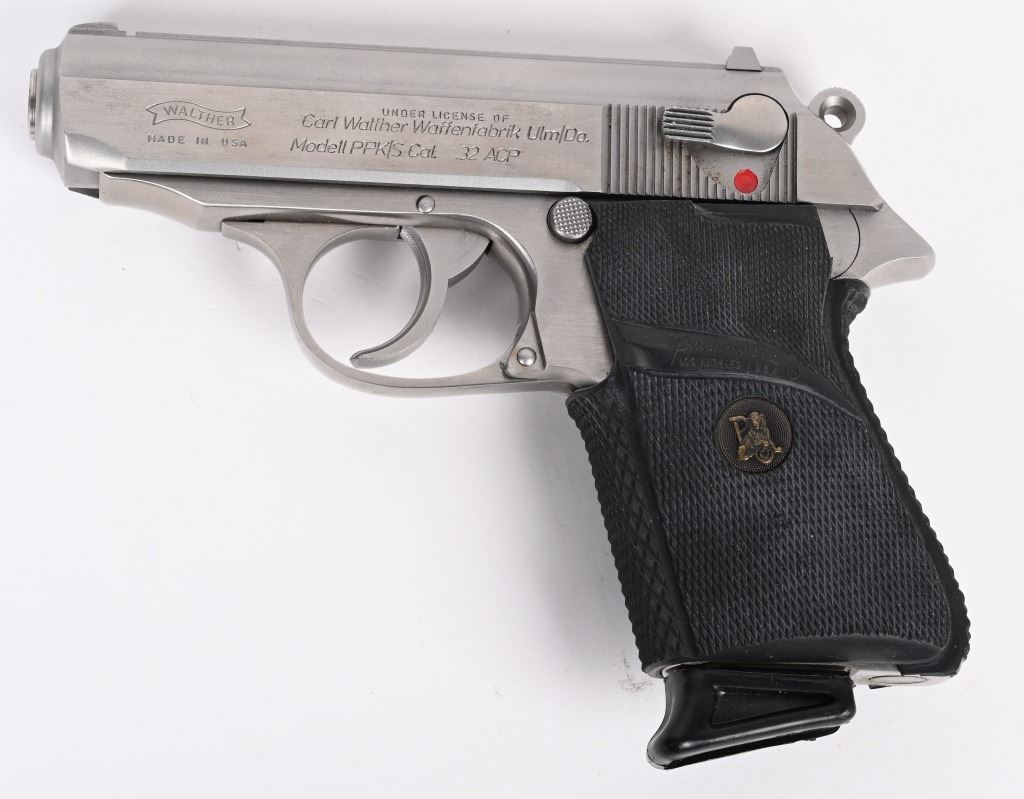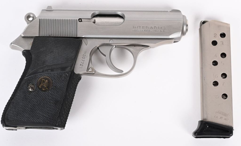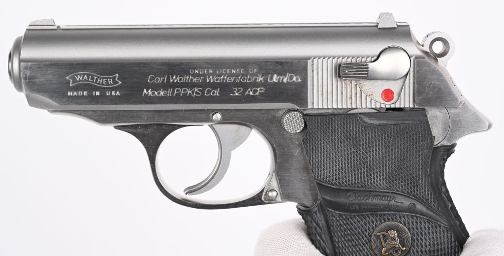 SERIAL NUMBER: W007721. BARREL: 3-1/4". CALIBER: .32 ACP. MANUFACTURED: 1990'S. Extremely uncommon Stainless steel American Made Walther PPK/S chambered for the 7.65 / .32 acp cartridge. Made by a subsidiary of Interarms, being licensed by Walther. Standard markings and sights. Polished stainless finish. After Market Pachmayr rubber grips. Factory nickel eight round metal magazine. CONDITION: Excellent overall, with a few light scratches. Bore is shiny with crisp rifling. Magazine is excellent. MODERN