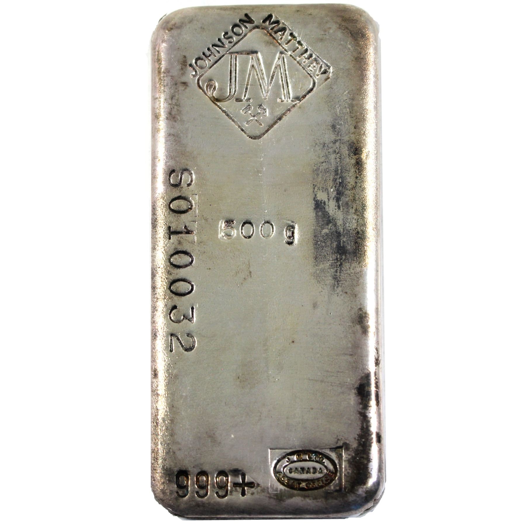 RARE! 500g Johnson Matthey old Pour Silver Bar with Diamond JM Logo with Crossed hammers at Top center, Serial Number sideways on Left with Oval JM assay office logo at bottom. Serial# S010032. In pristine condition. (Tax Exempt)