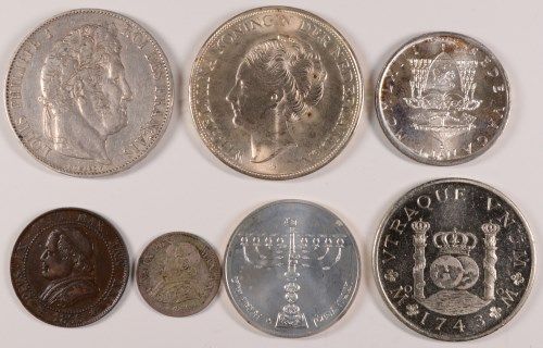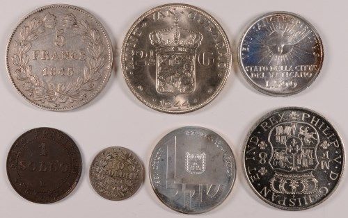 RARE! 7 FOREIGN COINS SILVER: 1743 SPAIN RESTRIKE BU, 1845 5 FRANCS, 1963