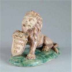 Lot # 1286 RARE ADVERTISING FIGURAL ART POTTERY COMPANY PLAQUE. A seated lion holds shield with “The American Encaustic Tiling Co.” written and mounted on a raised green colored oval base. Probably used in shops selling company wears. SIZE: 6” h x 8-1/2” l x 4-1/4” w. CONDITION: Very good. 9-97997 (500-1,000)