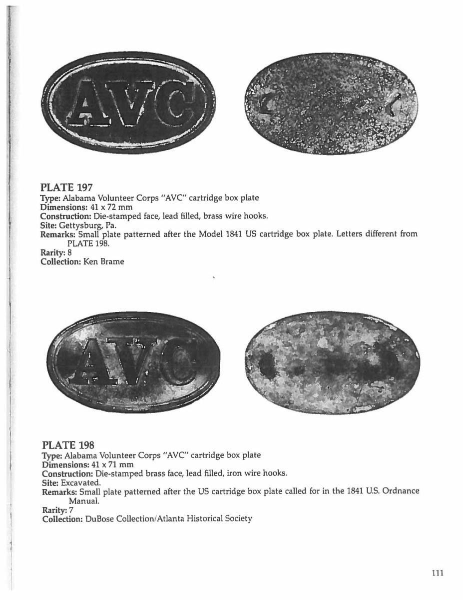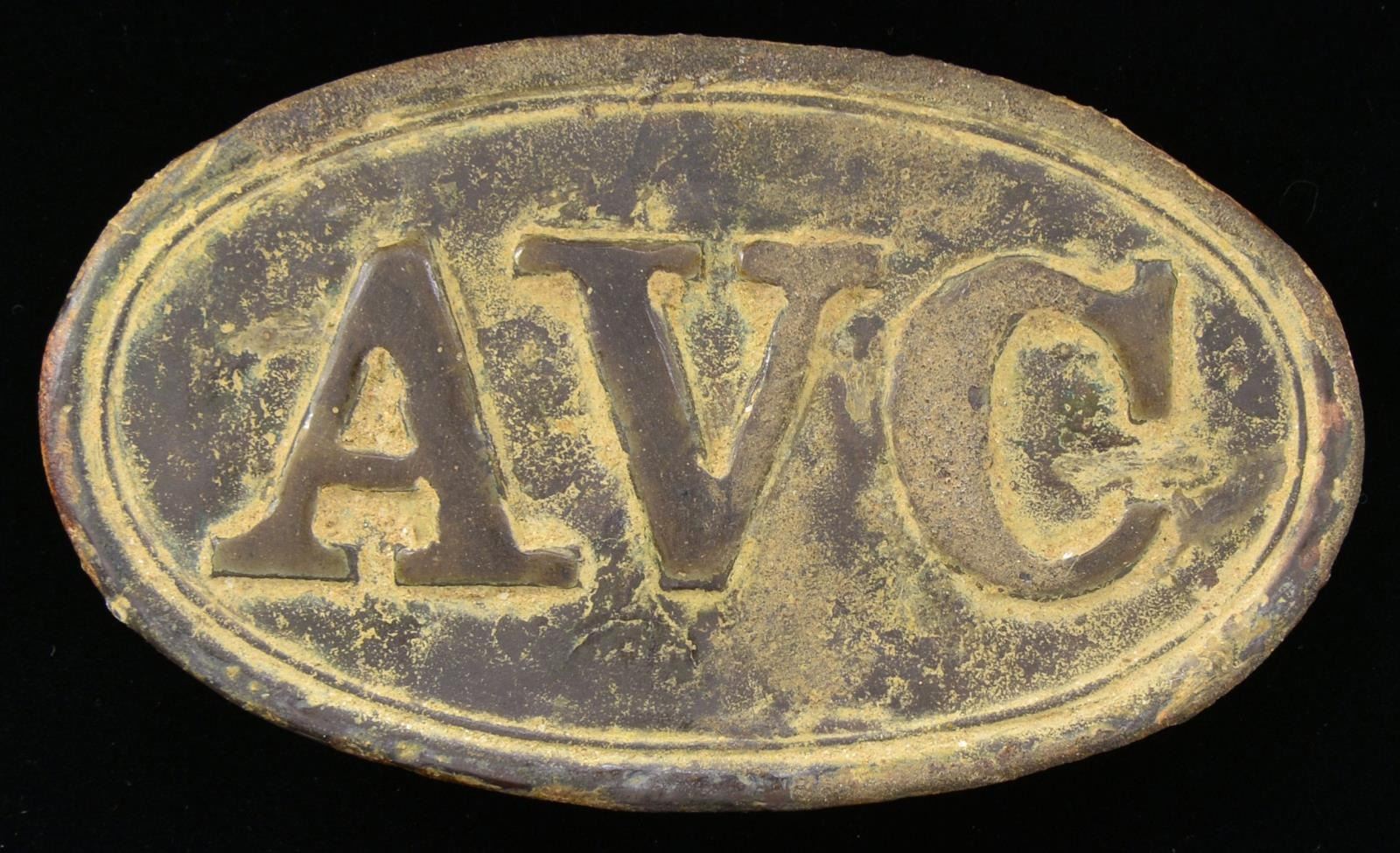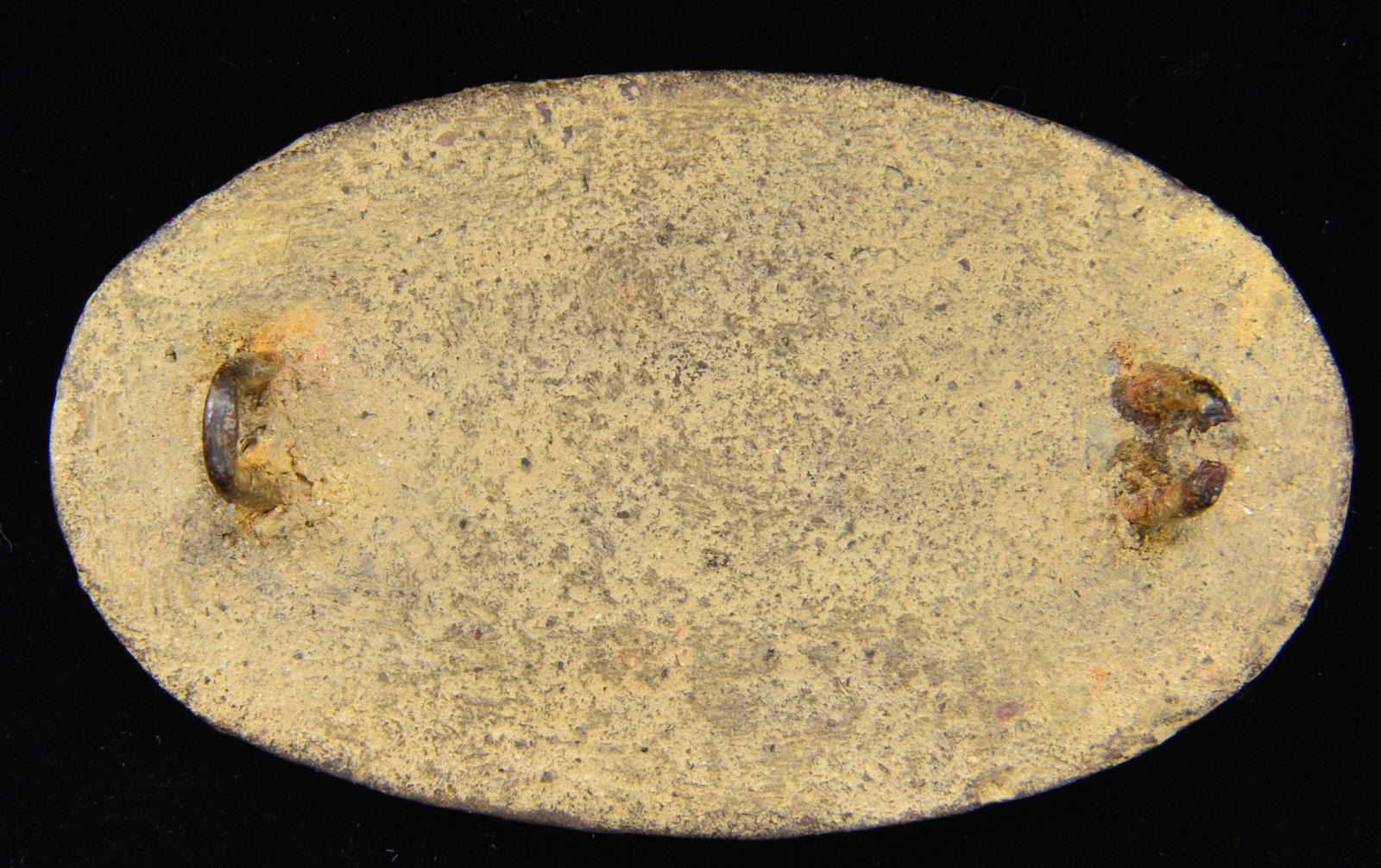 PLATE. 73.3mm x 43mm Prewar Alabama contracted cartridge box plate w/ 2 wire hooks was adopted after the US regulation “US” sm. box plate pattern 1841. These rare AVC accouterment plates are excavated in Confederate camps & battlefields. CONDITION: very good as professionally restored by Robert McDaniels, presents very well. PROVENANCE: Cullen Smith estate collection. (02-17241/JS). $3,500-4,500.