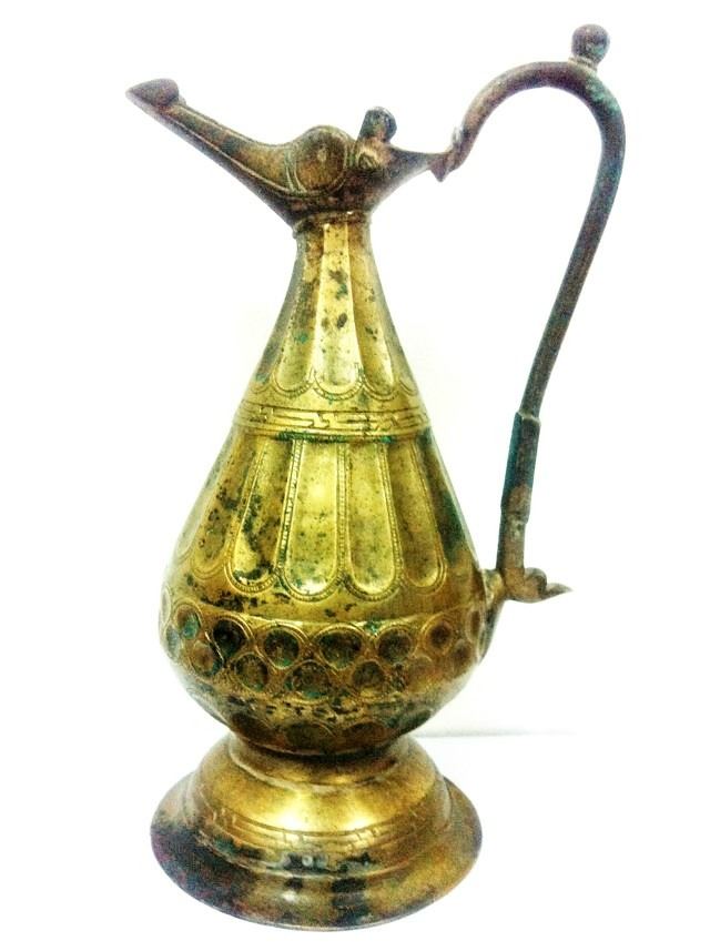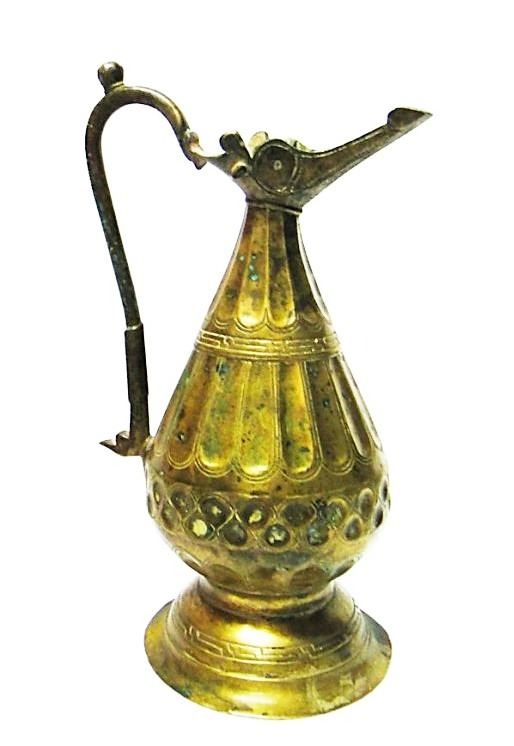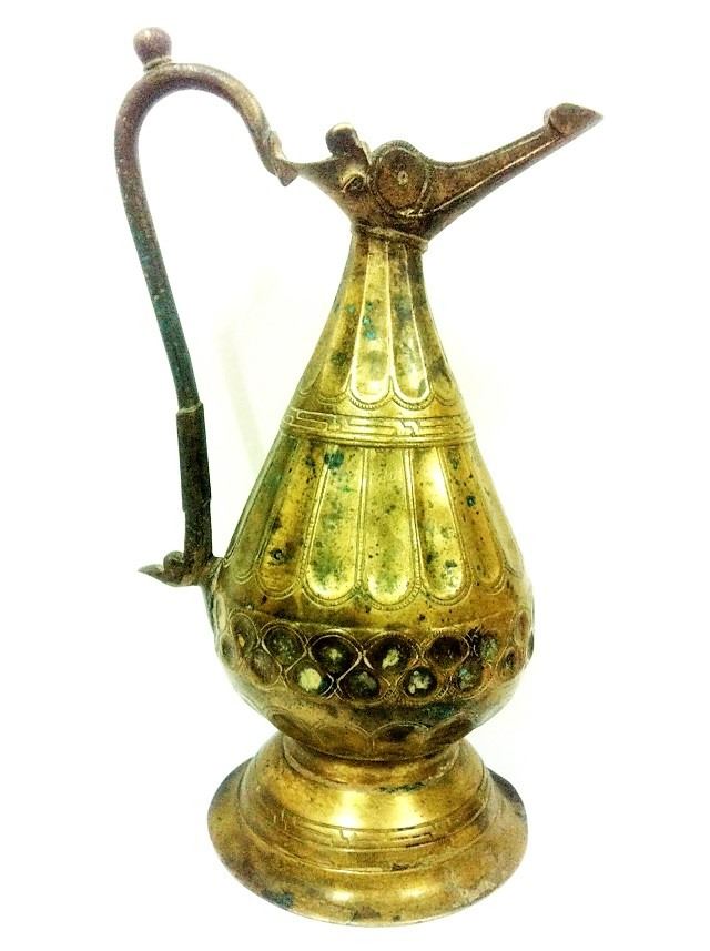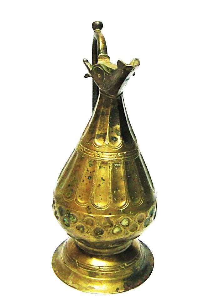A VERY RARE ANCIENT ISLAMIC ABBASID/SELJUQ ANIMAL HEADED BRONZE EWER KHORASAN CIRCA 11TH CENTURY. With head made in deer or bull. Of very high quality bronze, large size and very artictic work, possibly made for a royal family. With fluted rounded body on waisted foot, the intermediate section marked with two rows of concave circles, each facet underlined with a double engraved line, the spout modelled as a bull's head, the straight handle with thumb rest at top and bird-headed element at bottom, old inventory number to the foot