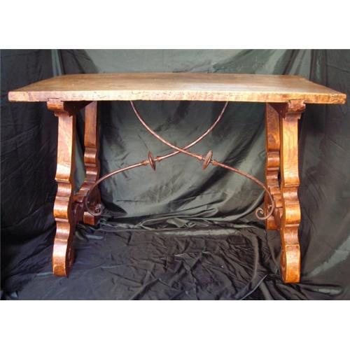 The table Fratino (young friar), that goes up again to the high Middle Ages was a plan leant against two bases fixed to the floor or against two easels and was in origin, has had various transformations in the years. The plan (table) was removable and giant, while supports have been joined with the so cross time between them through a robust one that form a frame. With the house retrenchment the young friar has got always smaller. what we here propose you has a plan in walnut of the century XVII, while the cross one is of chestnut wood. The binding is realized of iron beaten to create a sinuous and elegant form. the contrast between the "raw" plan and the volutes of the cross one make this small table suitable for every environment, not only for kitchens or rooms from lunch.