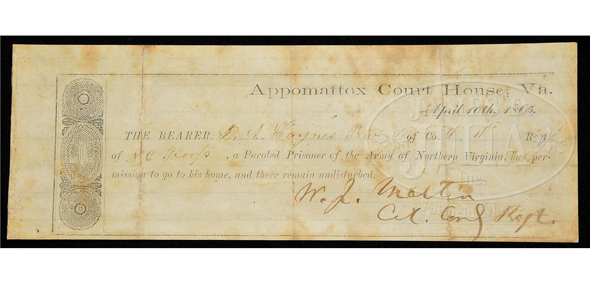 The terms of surrender between the Union and Confederate forces allowed parole passes to be issued by Confederate officers. These passes were printed on various field presses near the Appomattox surrender site. These slips of paper (about 8" x 3") allowed a soldier transportation and rations on his way home. This document assured him that he would not be attacked or imprisoned by Union forces. Though many thousands of these paroles were issued, few survive today and many are in terrible condition. This particular pass to a North Carolina soldier presents beautifully, the ink and printing being easily read. Daniel A. Haynes, who this parole belonged, was member of the 11th North Carolina Infantry and fought side by side with his son, Daniel H. Haynes, who was killed by his side July 1, 1863 at the Battle Gettysburg (the 11th North Carolina had over 450 casualties in this battle). This parole is signed by Colonel of the 11th North Carolina, W. J. Martin. The National Park Service at Appomattox has a good data base on these documents for further research. CONDITION: Paper is very good, as restored. Document was cracked at each of three folds and has a 2" tear at left margin, which have all been stabilized and conserved, being laid on rice paper. 4-49309 JS35