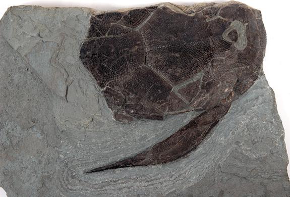 RARE ARMORED FISH. 375 million years ago there was an arms race going on in the oceans between fish and the fierce predatory sea scorpions know as Eurypterids. Most fish were slow swimming jawless bottom feeders and developed thick body armor to protect themselves from attack from the scorpions. Some of the best armored fish such as this 5X4 inch Bothriolepis Canadensis had their entire head, body and even their pectoral fins covered in a thick patterned bony armor with only their tail exposed. This large Bothriolepis specimen was found near Miguasha Bay in Quebec, Canada excellently preserved on a 7 x 8 inch grey slate slab with one of its two 4 inch long armored pectoral fins perfectly preserved and very fine detail on all of the armored plates covering the head and body. These important interesting fossils can no longer be obtained from the quarry and only are available when collections are sold.