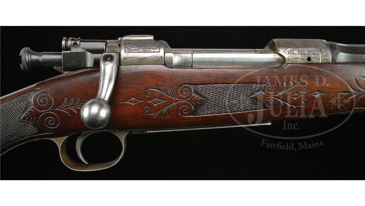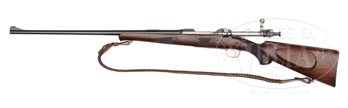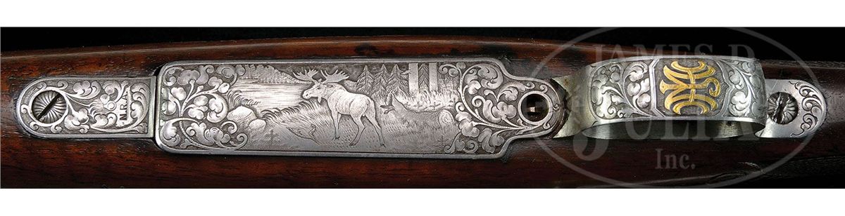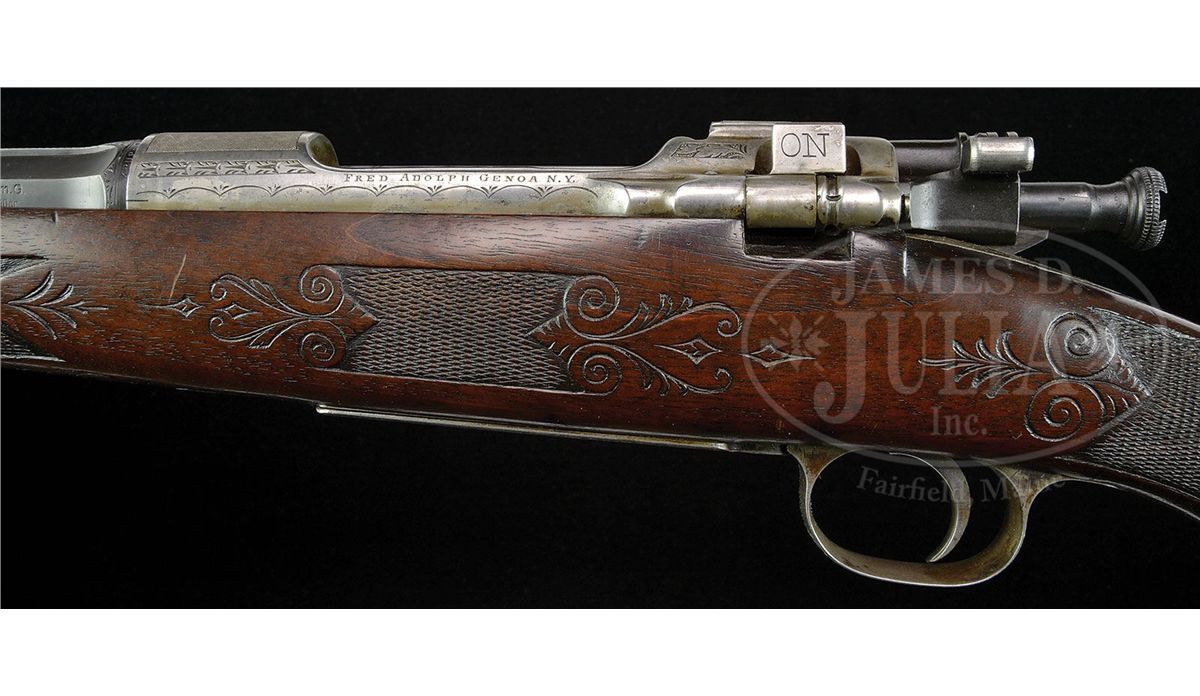 SN 77805. Cal. 30-06. 24-1/2" One third octagon to round integral, matted, ribbed bbl is mounted with three folding leaf U-notch rear sights, and bronze bead front longitudinally dovetailed into raised portion of rib, forming ramp. Bbl is stamped with assembly number, German proofs, and is marked "KRUPP STAHL GERMANY" around rear. Gray, case hardened, 1903 Springfield action is essentially unaltered from its military shaping. Receiver ring is nicely stippled, and is engraved with flourishes of oak leaf and acorn, scroll, and large geometric borders. "Fred Adolph Genoa N. Y." is on left side wall. Cocking piece has been dovetailed for peep sight. Bottom metal marked "N. R. A." and with flaming bomb, is nicely engraved with well cut, open, scrolled acanthus framing vignette of bull moose in wilderness meadow on floorplate. Monogram "JHM" is gold inlaid on trigger guard bow. Relatively plain American walnut stock measures 13-1/4" over engraved and serrated trap steel buttplate. Stock is embellished with classic checkering terminated by incised scroll carving, which is a signature to Adolph's work. Right hand cheekpiece is nicely molded. Stock also features sunburst horn grip cap and schnabeled tip. Drop at heel: approx 2-15/16", drop at comb: approx 1-3/4". Weight with sling: 7 lbs. 5 oz. LOP: 13-1/4". Rifle is fitted with a German braided leather sling. CONDITION: Excellent,as found. (Consignor states found at a local yard sale.) Bbl retains 95% of what appears to be its orig custom blue. Action retains a considerable amount of its orig very light case hardened color, almost a French gray, which has silvered considerably at areas of normal wear. Stock retains most of what is undoubtedly its orig oil finish with hand worn patina at normal carry areas. There is a chip at toe, repaired using orig wood, some small chips at comb and behind action top tang. Buttplate top screw is loose and needs resetting. Bore is fine, slightly frosted, shiny with slight erosion at throat. Relatively new sling is excellent. 4-49293 MGM221