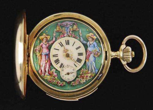 RARE AUTOMATON MINUTE REPEATER GOLD POCKET WATCH. Unmarked high jewel movement with three finger bridges & adjusted escapement with other adjustments. Mounted in a smooth gold hunter case marked "18K" with a French inscription on inside cover. Dial has a luminous green enamel background with small hour dial & a tiny second bit dial. It has a Victorian lady in enameled pink & blue dresses on either side with her hands raised to each strike a bell to mark hours & minutes. It is lever set, seems to run & functions well. CONDITION: As noted. Case is clean & smooth with minor handling marks & a small crease in back cover. 4-57710 JR586