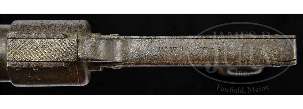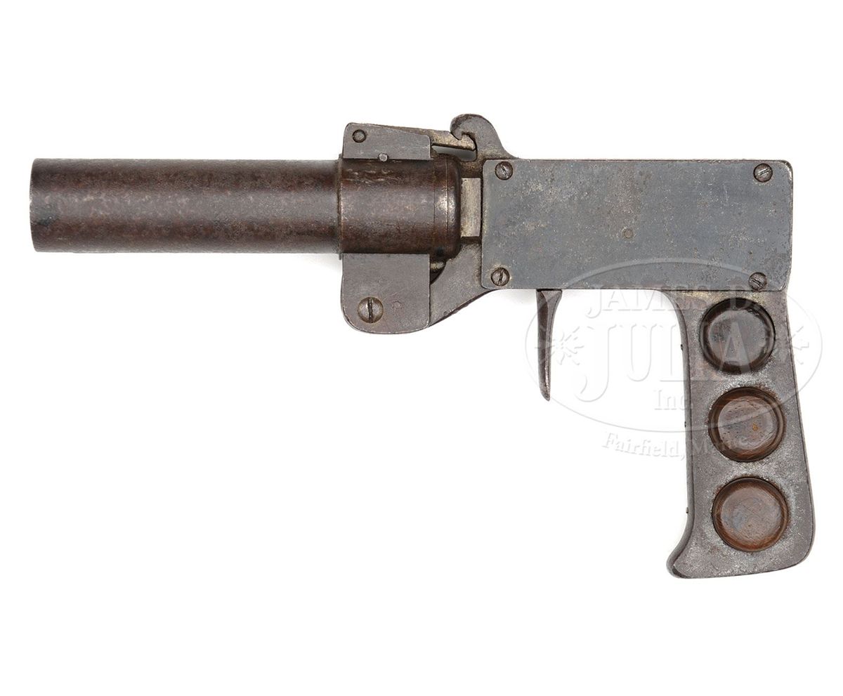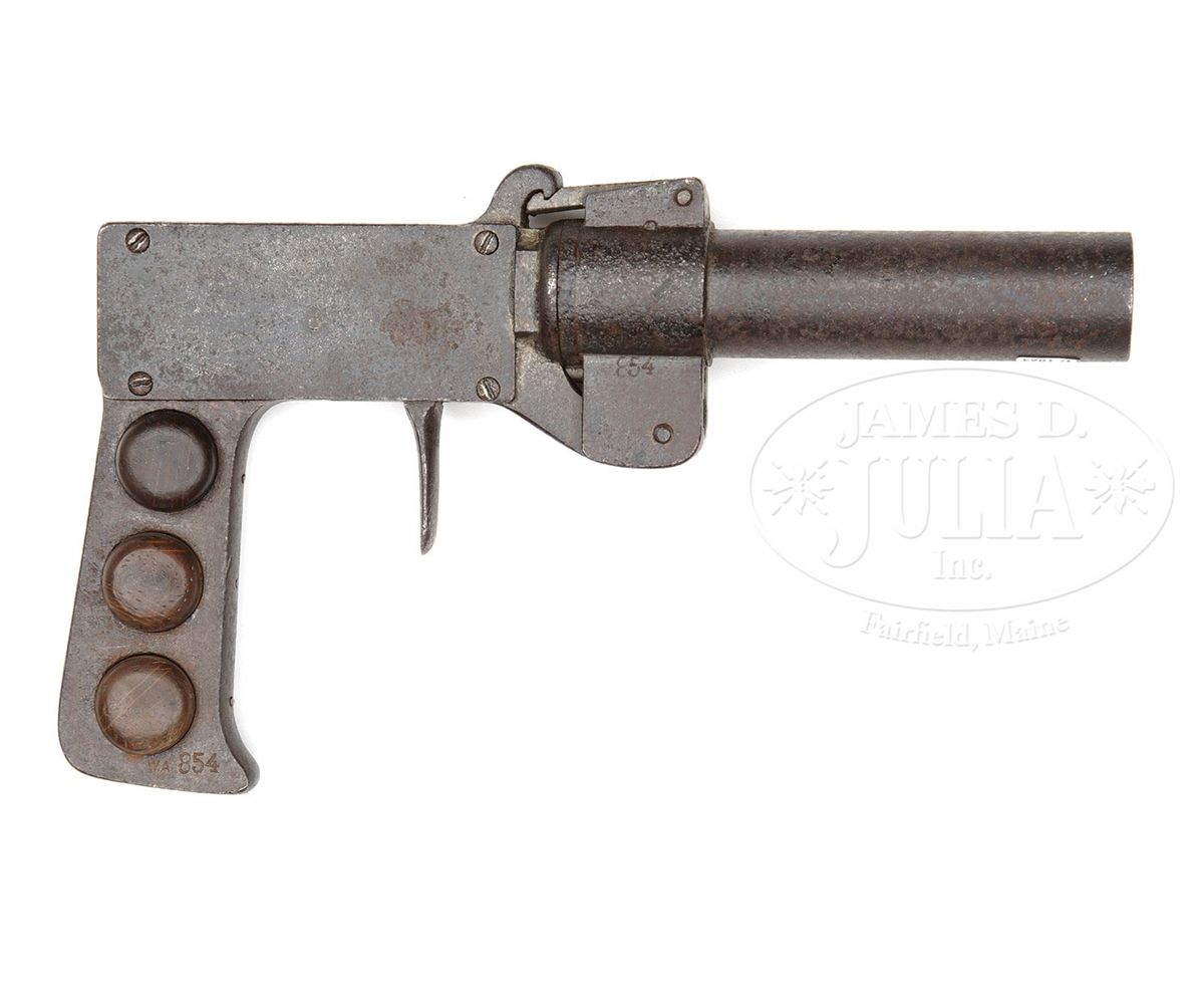 SN 854. 27mm 5" bbl with serrated steel top latch. Under chamber on left side is Crown/M proof. Top of frame is marked "AW.W.18" (made by Arsenalwerkstatte Wilhelmshaven in 1918) next to "No 854" (serial number 854). Steel grip area with matching serial number and three wood grip buttons. One of 1100 examples manufactured. PROVENANCE: Collection of Dr. Geoffrey Sturgess. CONDITION: Very good with light pitting overall and black finish has been restored to about 70%. Wood grip buttons are excellent with light wear. Bore has light pitting. 4-52726 BWS135