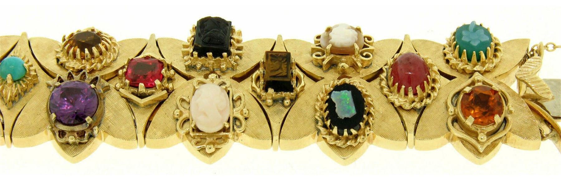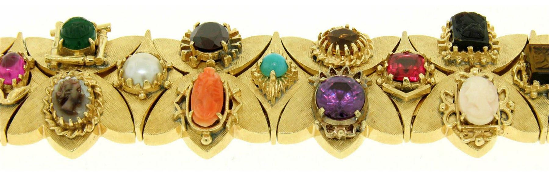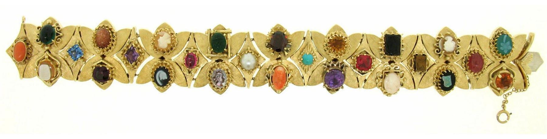 A wide, antique, solid 14k yellow gold charm bracelet with 18 florentine finished slide charms which are set with 27 gemstones of various shapes and colors. It weighs a total of 100.0 grams, measures 27.50mm wide, and measures 7.5 inches in length.