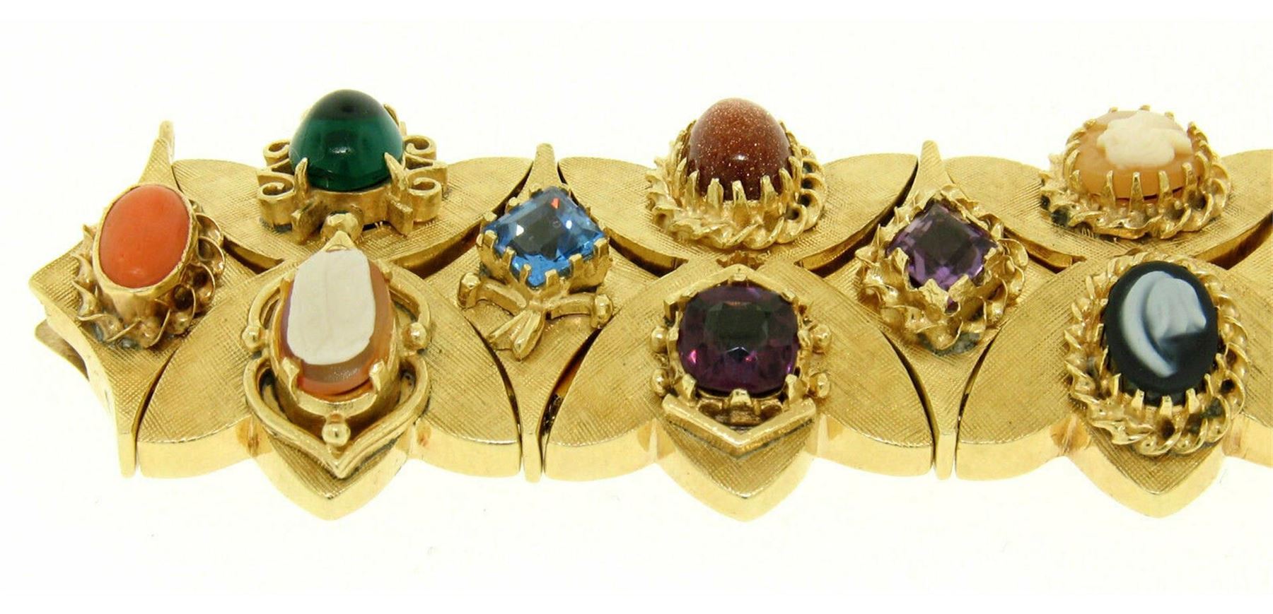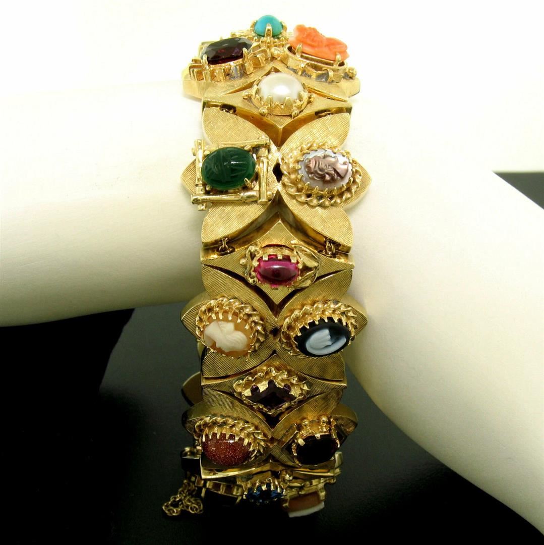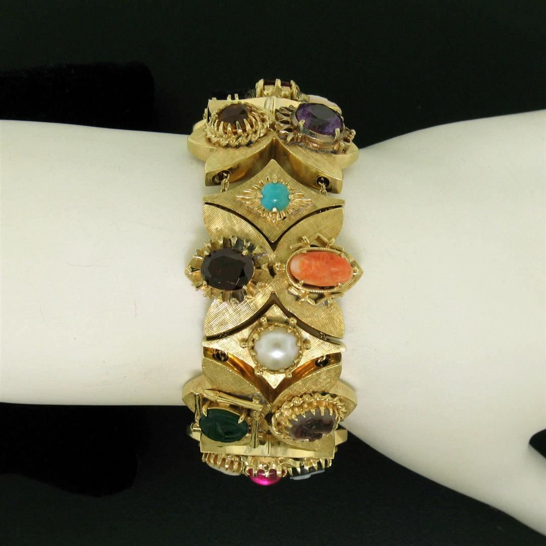 A wide, antique, solid 14k yellow gold charm bracelet with 18 florentine finished slide charms which are set with 27 gemstones of various shapes and colors. It weighs a total of 100.0 grams, measures 27.50mm wide, and measures 7.5 inches in length.