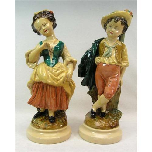 A lovely pair of antique Borghese Italian chalkware figurines with the original Borghese labels on the bottoms.