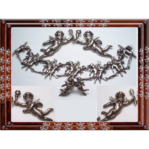 This 70 gram sterling set is pre-1900 and is one of the most remarkable sets I have ever seen. ( I have more photos if you want to email me) You have all the original pieces which include TWO large ( 2 1/2?) cherub pins that face each other, screw on earrings and the matching bracelet. One of the unique things about this set is that the facing cherubs hold a different object and are not identical . This means that each piece was made and poured by hand. You can tell by the cherub faces that these are old and not newer reproductions. Lovely child like faces with such charm! The bracelet is 7? long x 1 1/4? wide and is marked in two places ?sterling?. It has has a hidden slide in clasp under one of the cherubs. As you can see by the photo next to a dime the brooches are solid and LARGE ( 2 1/2? each). ALL the pieces are marked and all are SOLID silver and not hollow. I have never seen a whole set like this so you know that it is quite a treasure! The parure is in excellent condition and something collectors drool over when they hold it in their hands.