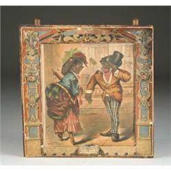 RARE BLACK McLOUGHIN BROS. DIORAMA.  Late 19th Century, as was typical of the time period the black people were portrayed within the various scenes in a comical nature with exaggerated features.  One of the scenes portrays a black gentleman seated in a chair playing a banjo while his friend frolics about.  Another scene depicts a dapper black gentleman tipping his hat to a young lady.  SIZE:  11” x 11”.  CONDITION:  Overall condition very good, some soiling and scuffing to outer frame.  A couple of scenes on roll have tears and have been taped.  JL 1-4300 (2,000-2,500)