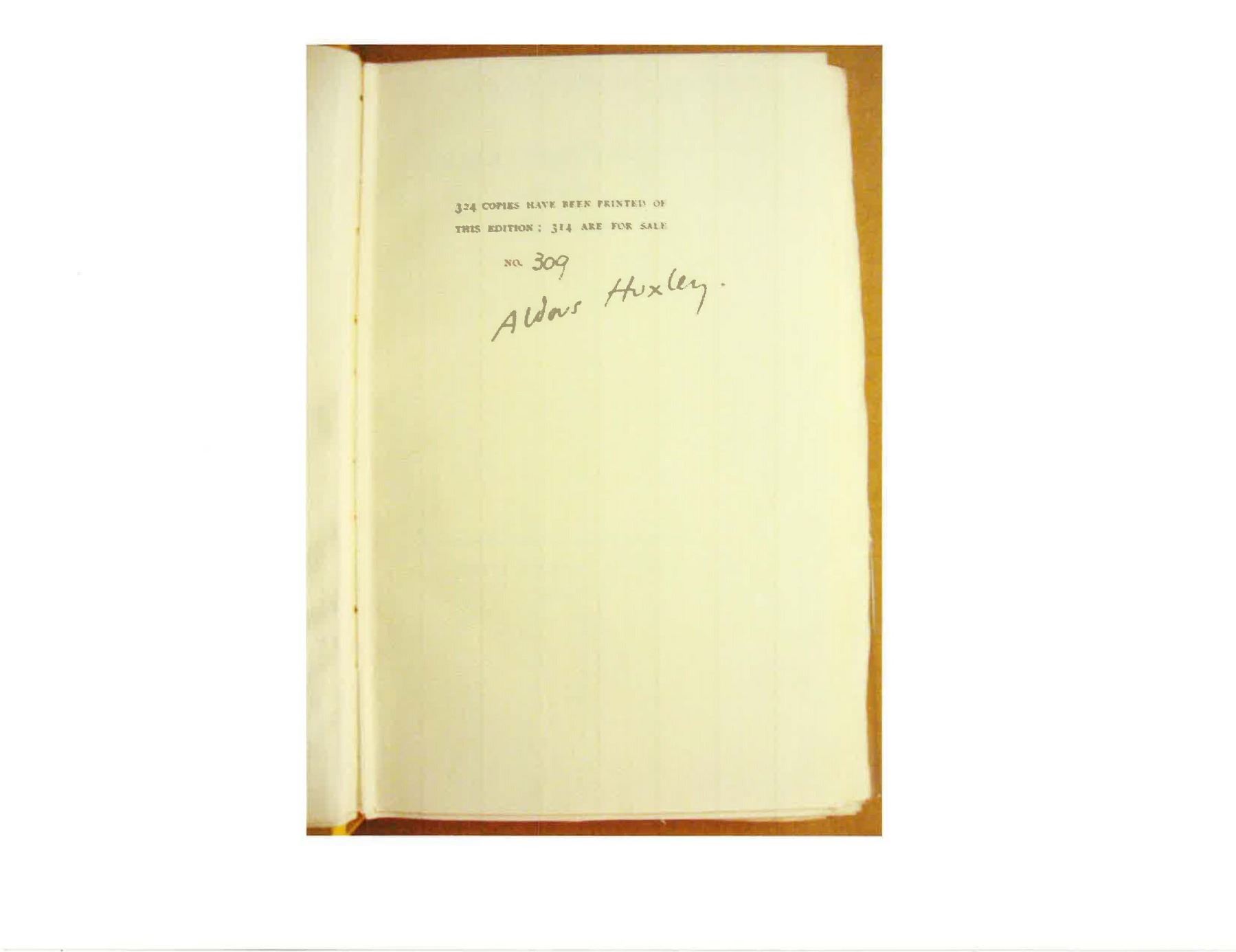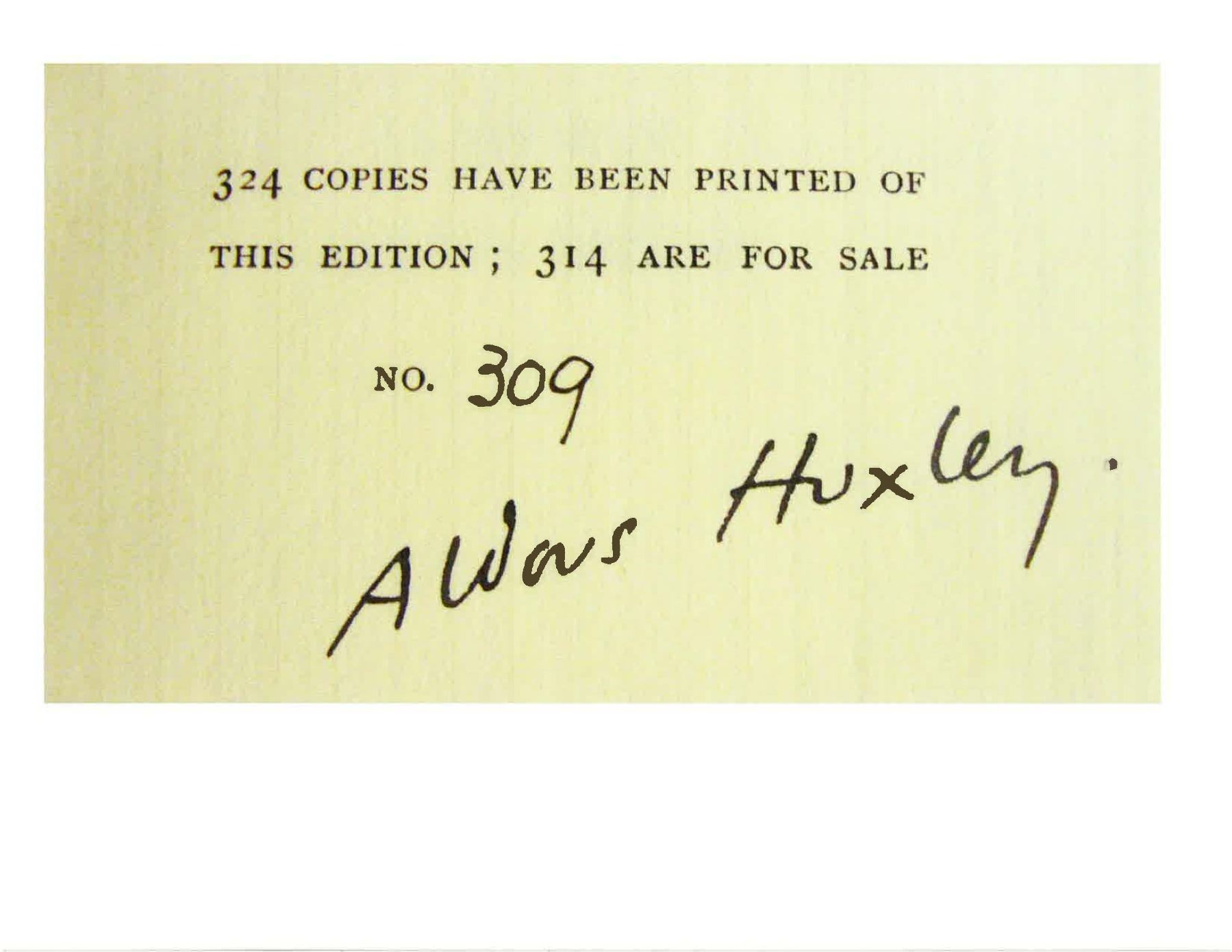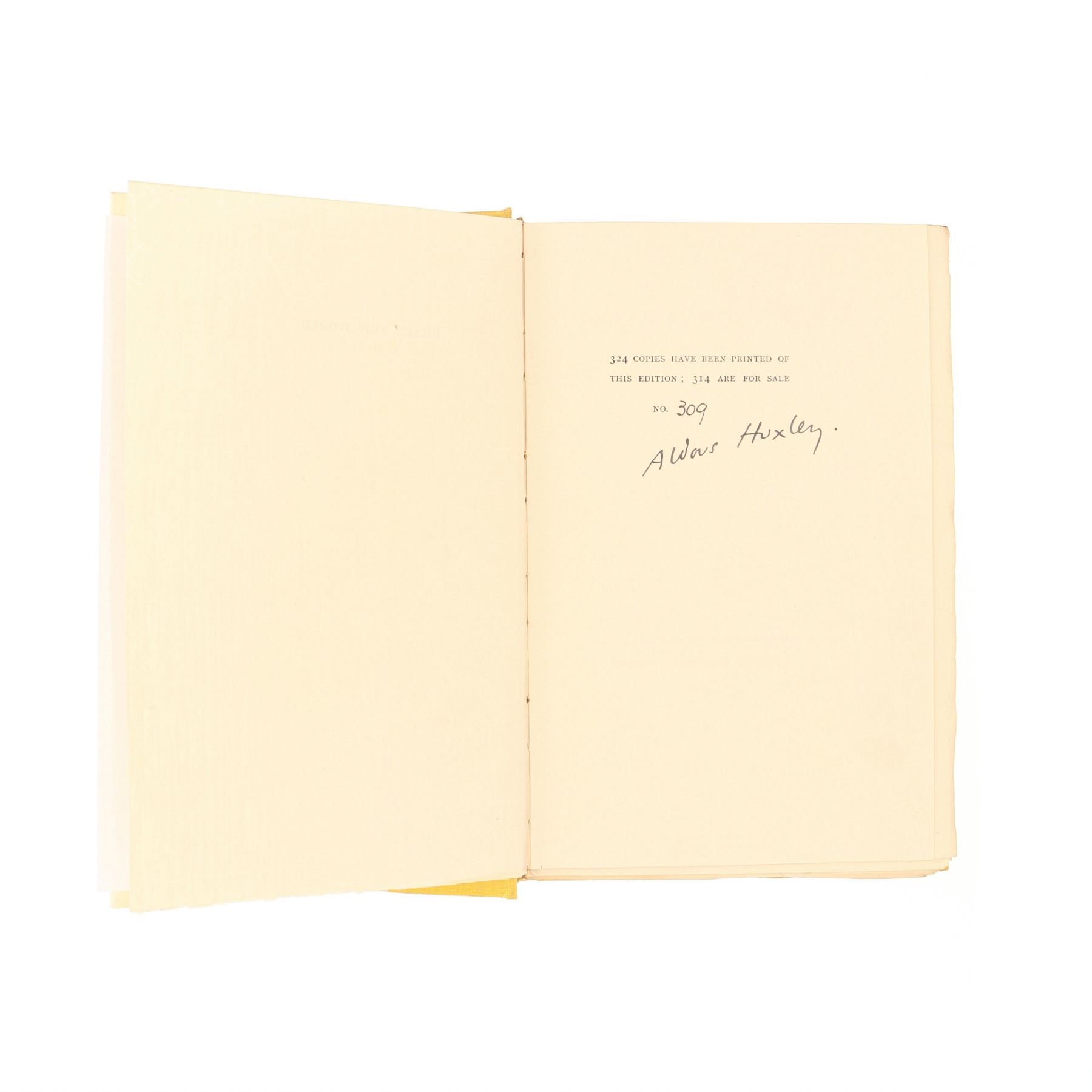 RARE BOOK B: "Brave New World" Chatto & Windus 1932 limited first edition signed by the author Aldous Huxley #309 of an edition of 314, the book has a yellow clothe cover with a blue title badge and gilt lettering on the spine and measures 9.5" h x 6.5" w x 1.5" d. and is cased in a custom clamshell case measuring 10.5" x 7.5" x 2.5". From Bauman Rare Books.